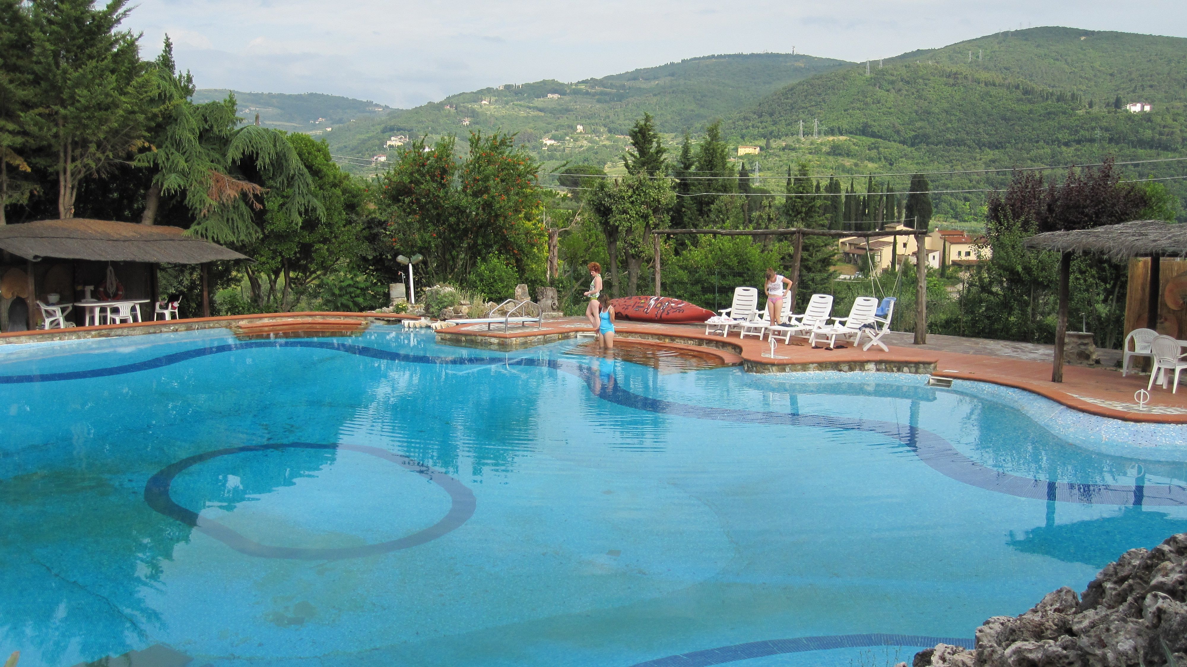 Thankfully, we arrived at the gate to our villa outside Florence without further ado. After gaining access via intercom, the security gate opened slowly to reveal a long tree-shaded gravel drive leading to a large two-storied building with a smaller residence out back. Driving to the back building we assumed would be our rental, we were pleasantly surprised to learn that, no, we had leased the larger accommodation complete with spacious vine-covered patio, huge living room, gigantic kitchen, three spacious bedrooms, two complete bathrooms, and best treat of all: lake-sized naturally landscaped swimming pool with stunning view of Tuscan hills.
