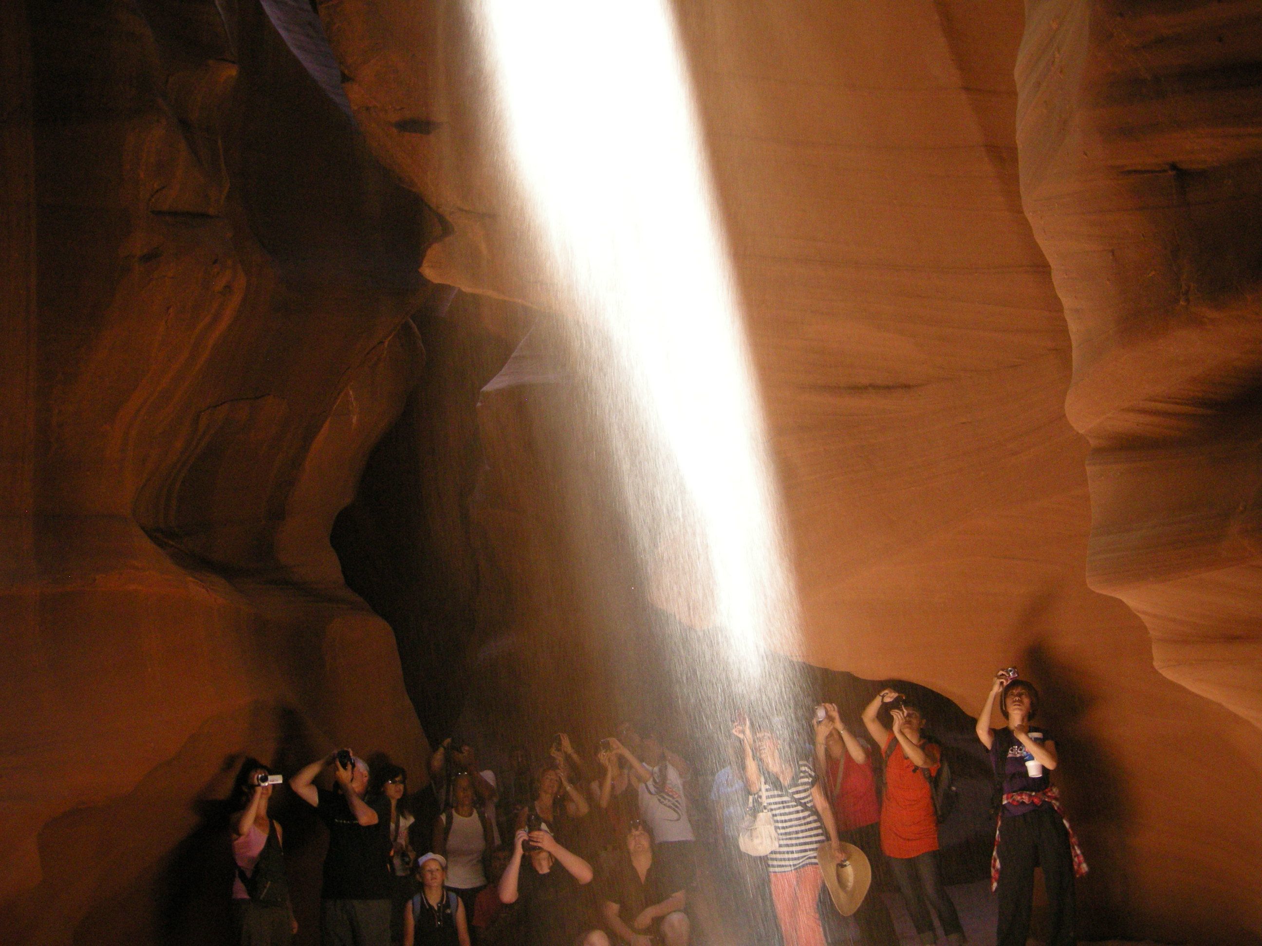 Moment magique attendu chaque jour dans Antelope Canyon (Arizona, USA) quand la lumière zenithale passe par un trou de la roche.