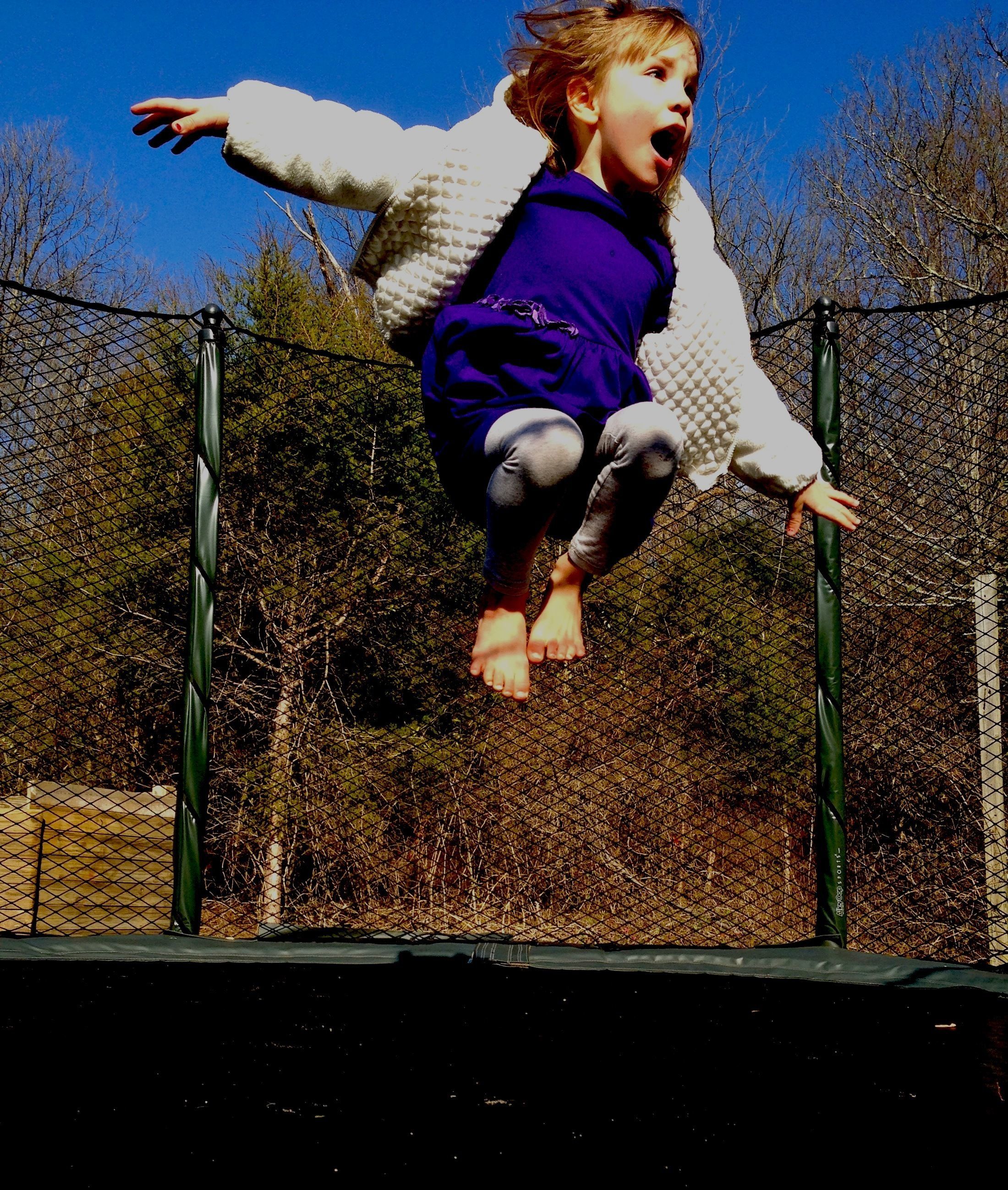 This my granddaughter having a blast on a neighbors trampoline. I love the joy on her face!