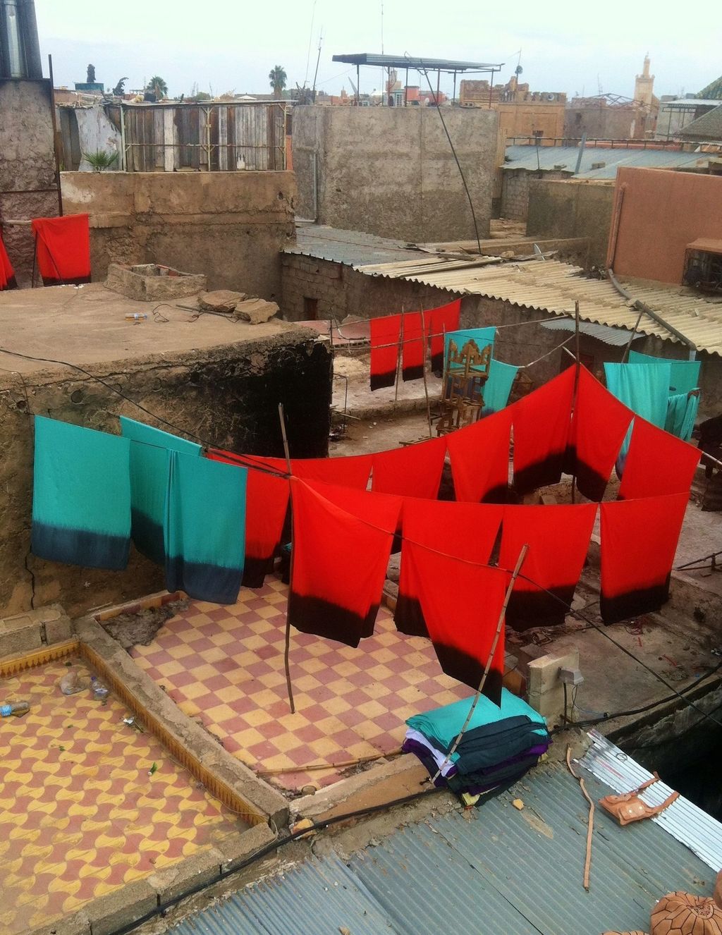 The local silk hanging to dry after dying. The beautiful colors pop out of the drab background.