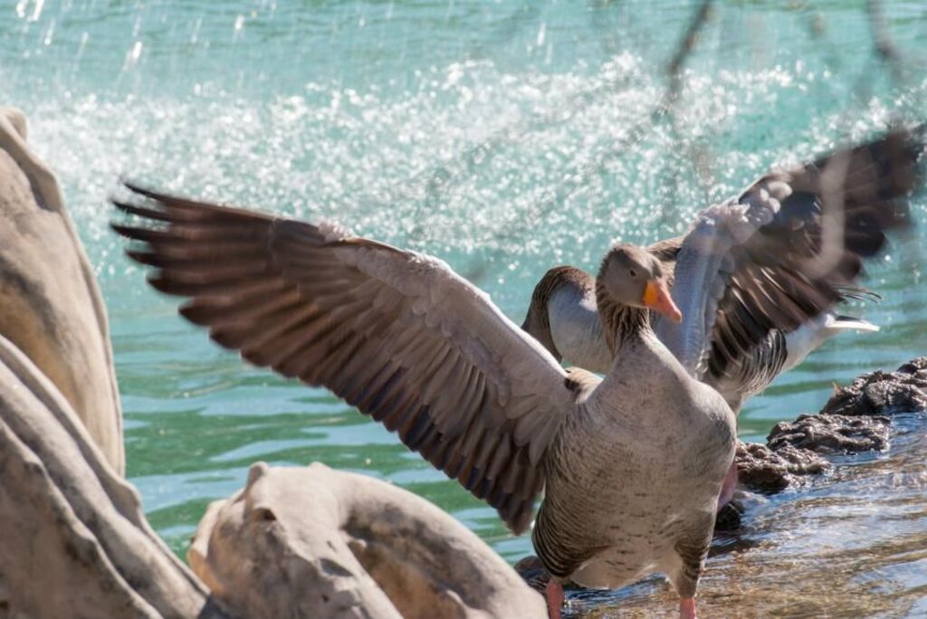 tentativo di volo da parte di un'anatra tra le acque del laghetto nel parc guell di Barcellona