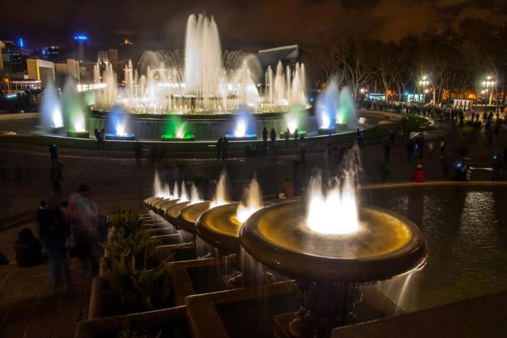 movimento rallentato delle fontane di Barcellona sotto un tappeto di nuvole