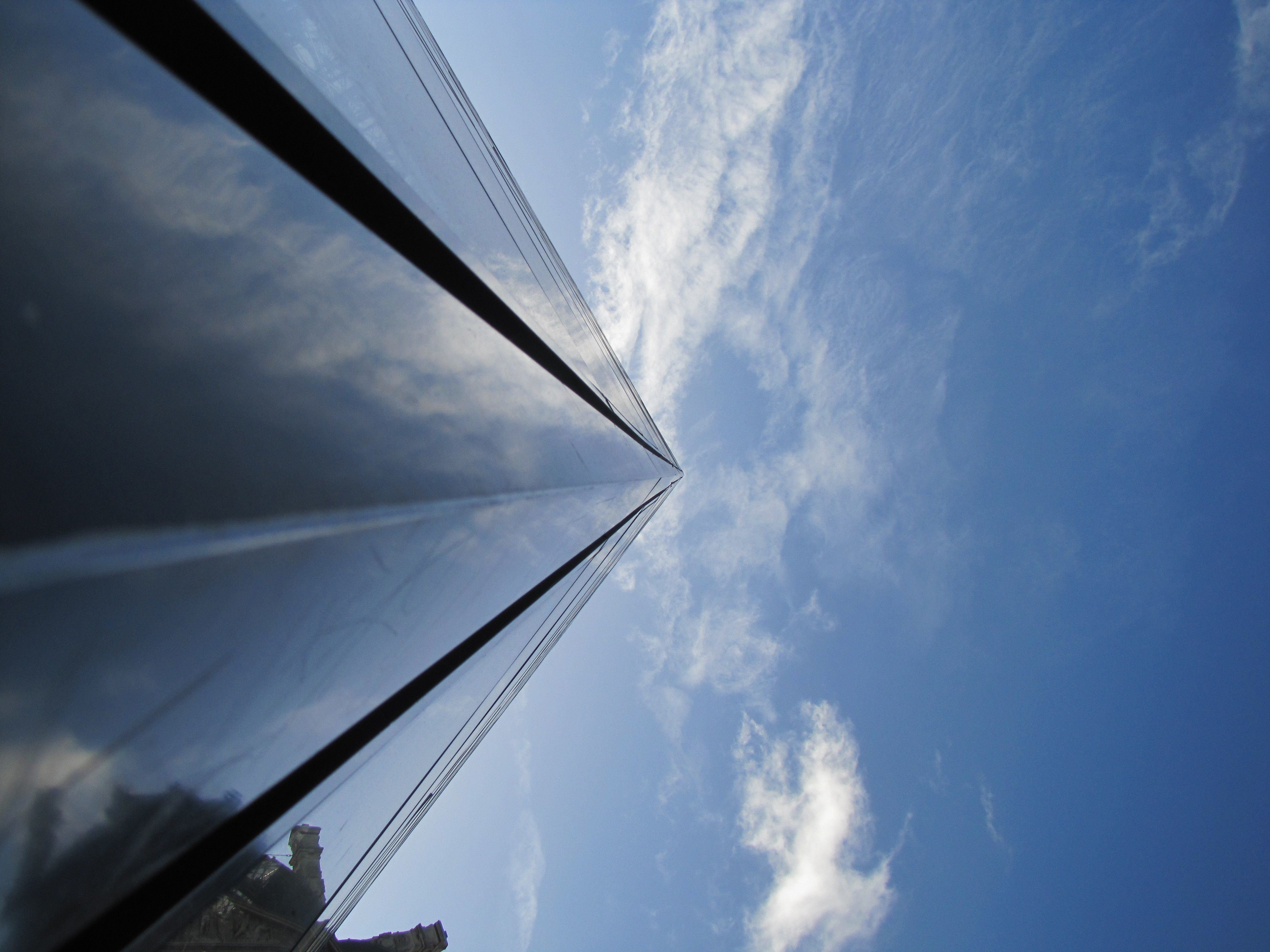 Parigi. La parte più alta del louvre si rispecchia nel cielo limpido.