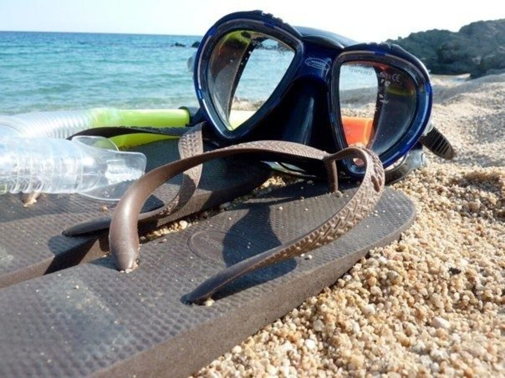 This photo was taken by my daughter on a beach in Halkidiki, Thessaloniki, Greece. It captures the spirit of a beach holiday.... flip-flops, snorkles, goggles, sand and sea!