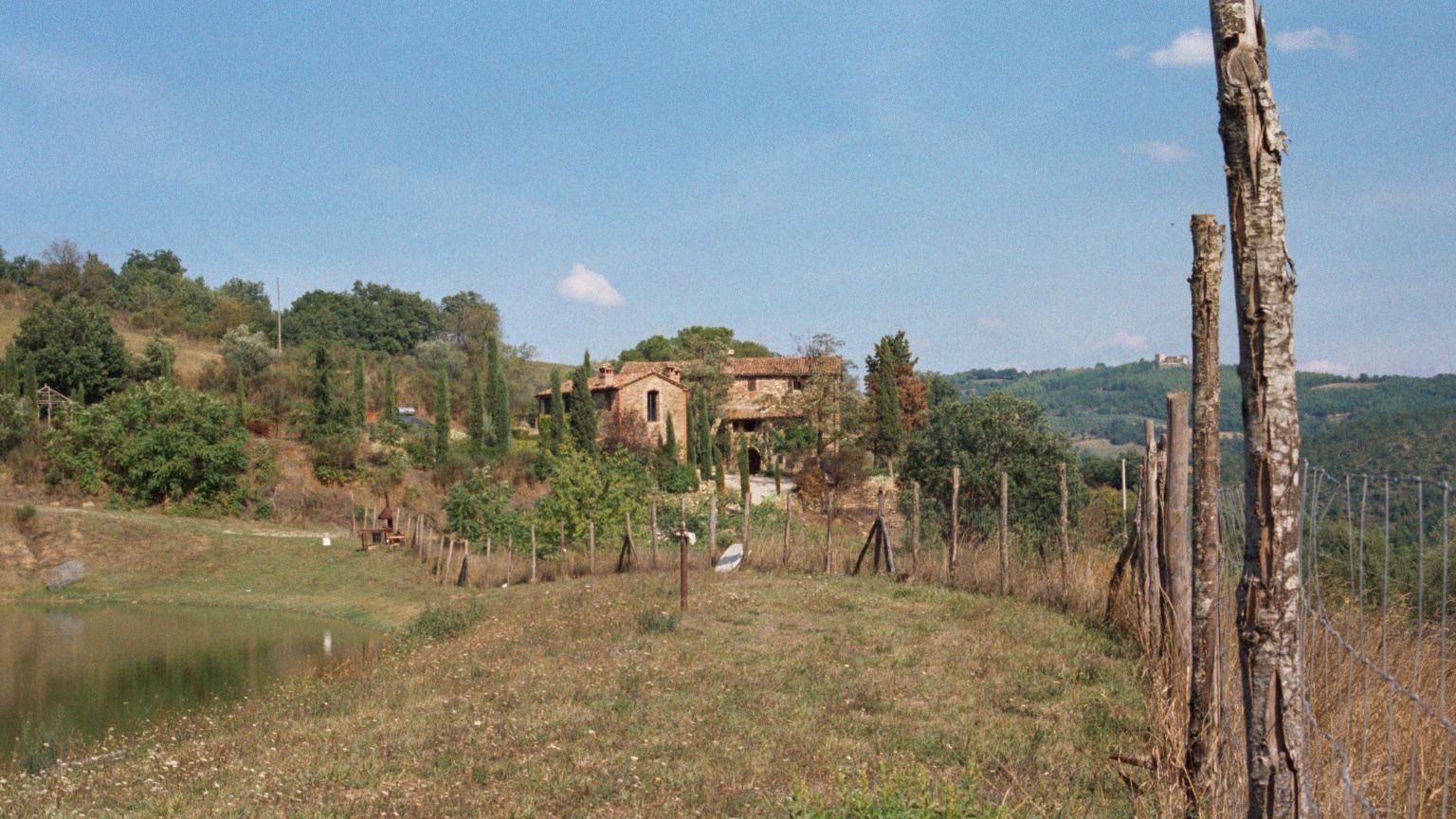 View of Tuscan farmhouse near Monterchi with fishing lake in foreground on a hot, sunny afternoon.