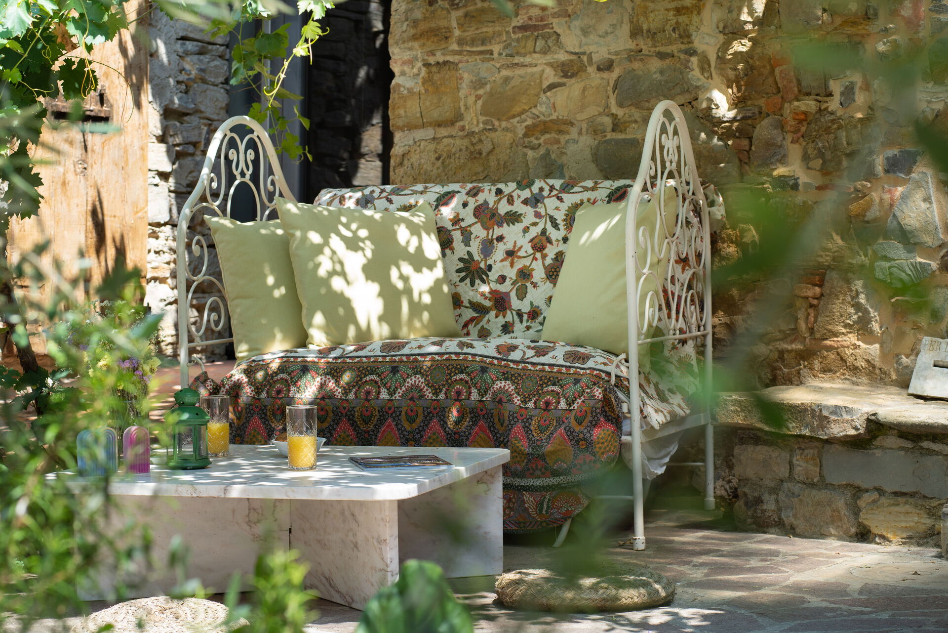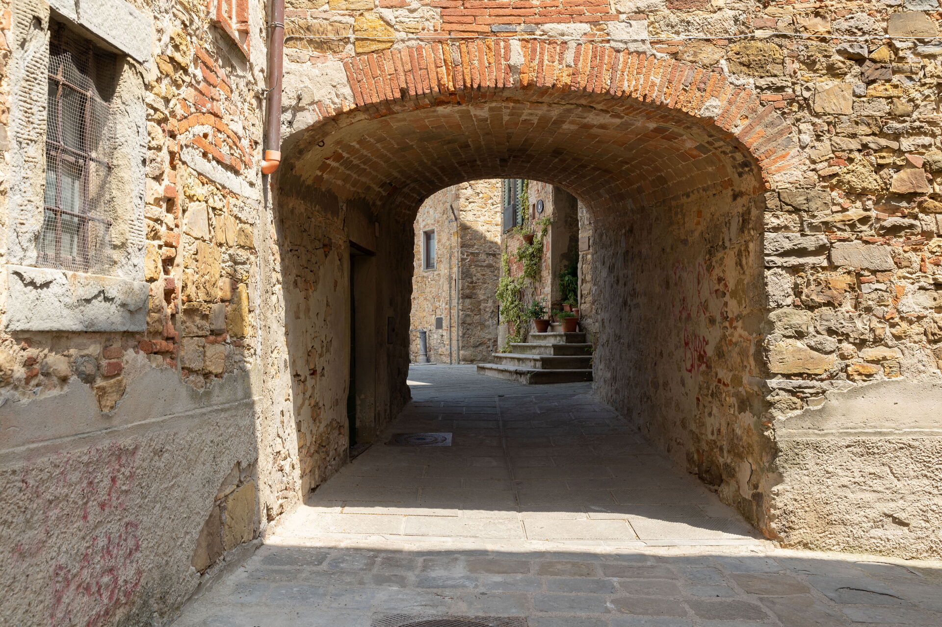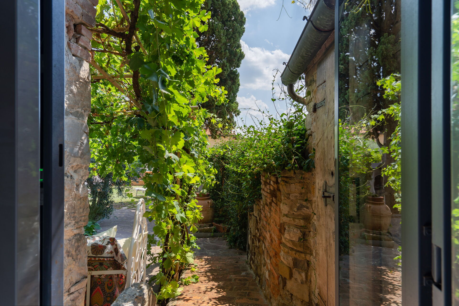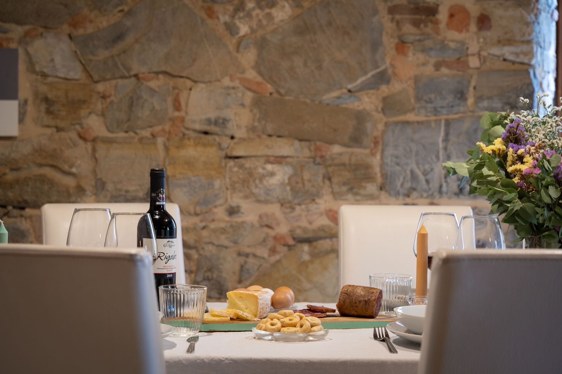 The main entrance is from a small alley of this small cute Tuscan village. From the door a big open plan room in stones and red bricks welcomes you to the daytime part of the villa, with a dining, kitchen and living area.