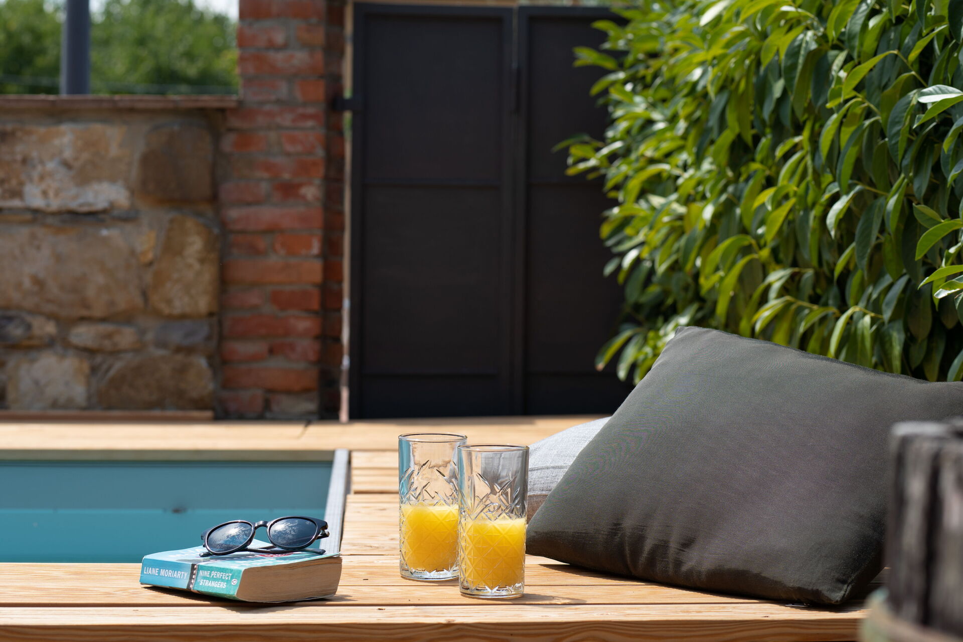A glass door, on the left side of the room, takes you to the private garden with a bathroom with shower and washing machine to the left, a large table where you can dine outside, a comfortable sitting area under a marquee and the loan with deckchairs and the (half) out ground pool (size: W/L: 200 x 499 cm H: 133 cm). This garden is very special being one of the few gardens in the centre of the village. Completely walled it grants privacy to you and your group.