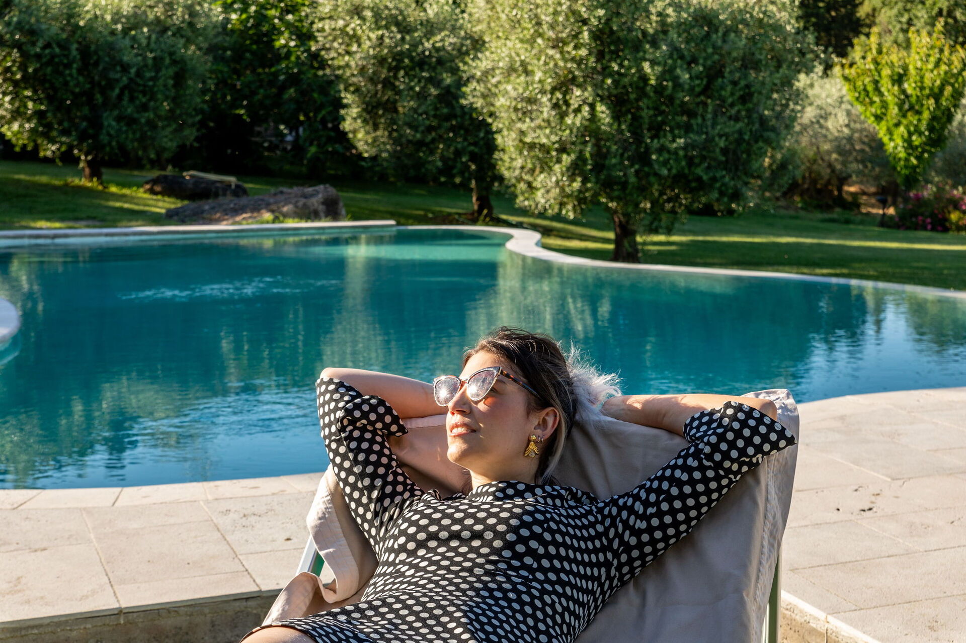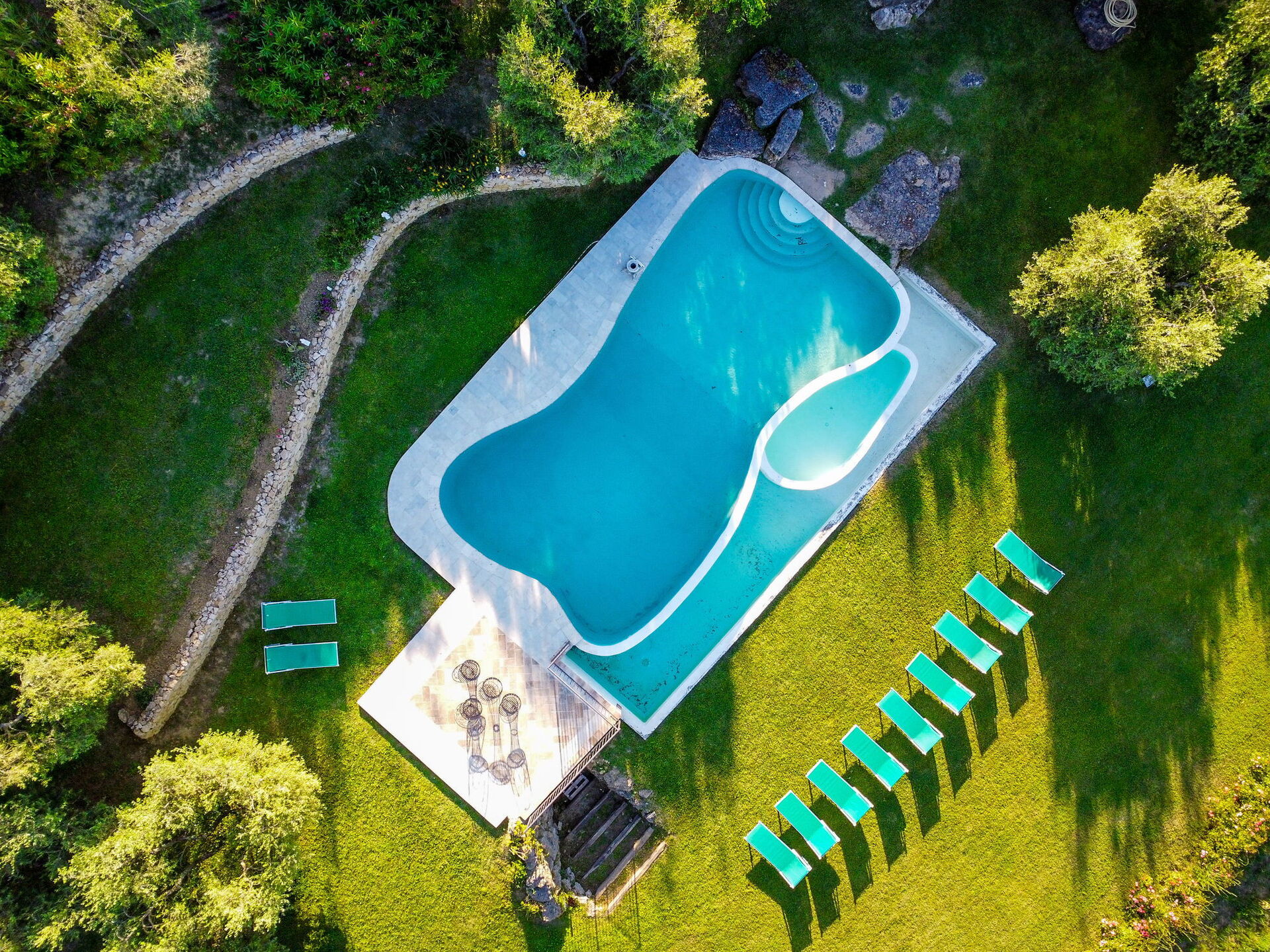 Garden (3000 m2): swimming pool (length: 12m, width: 6m), WIFI internet, barbecue, fireplace, al fresco dining, dining table (people: 16), gazebo, garden furniture, sunbed.