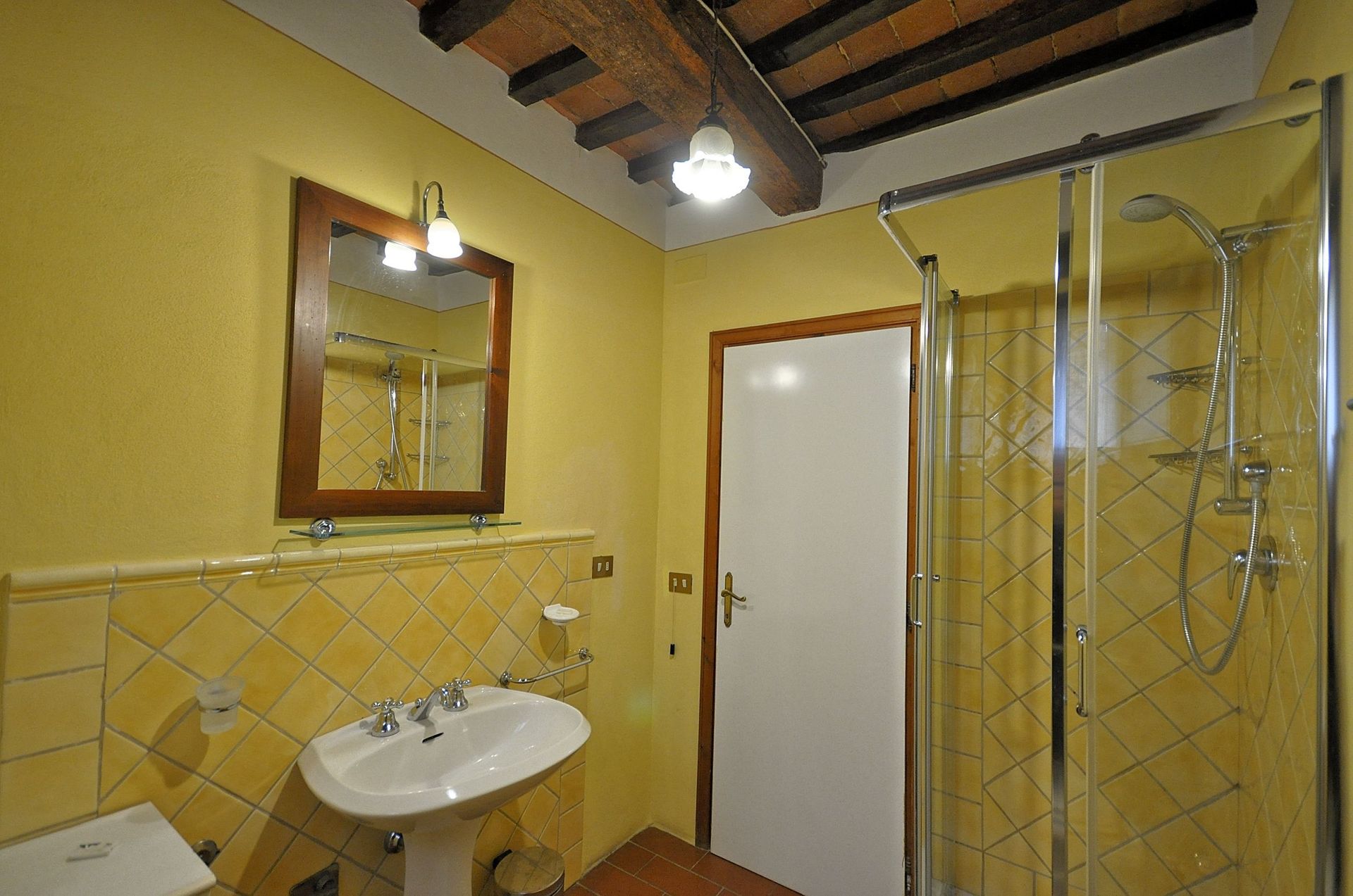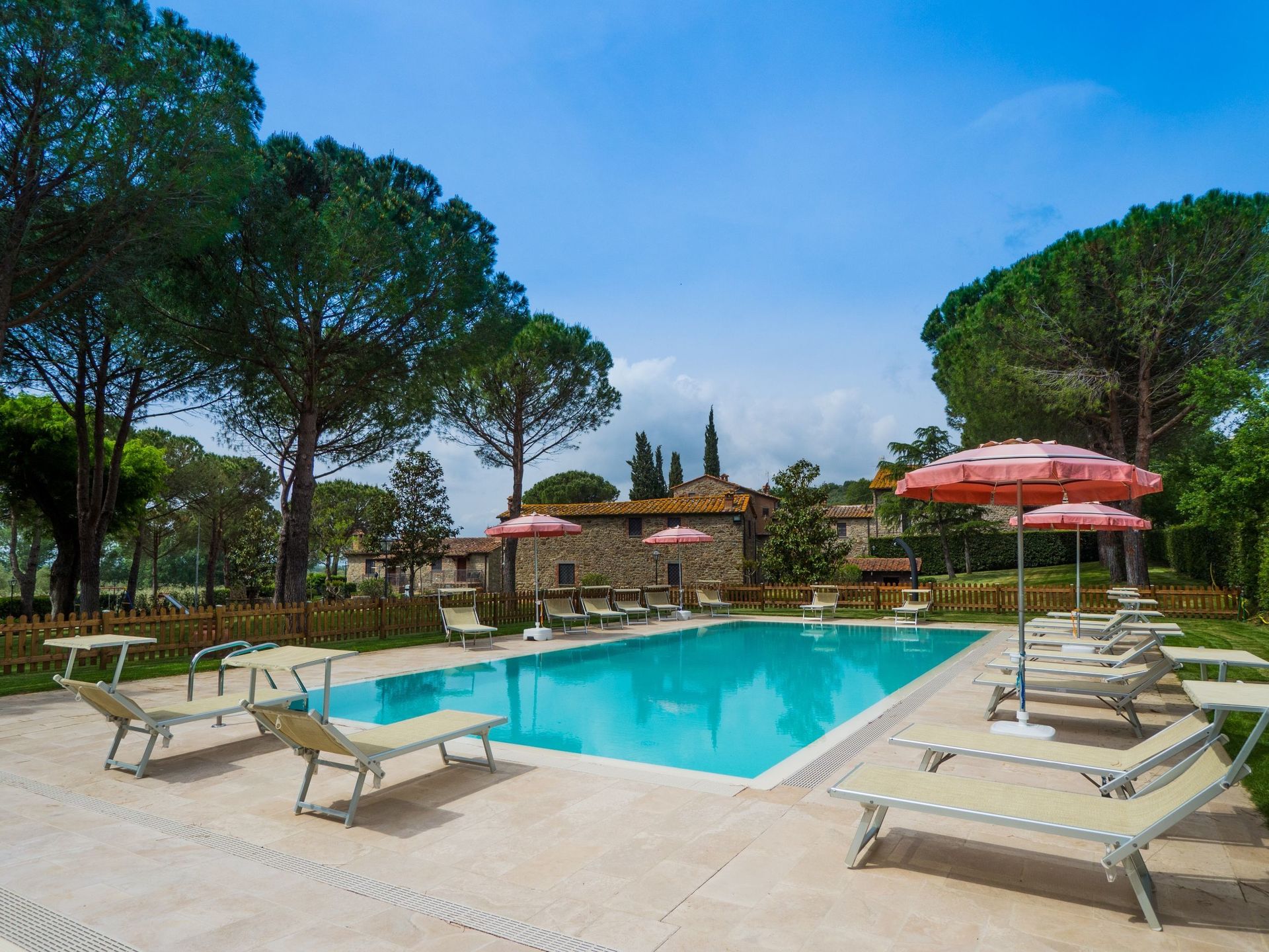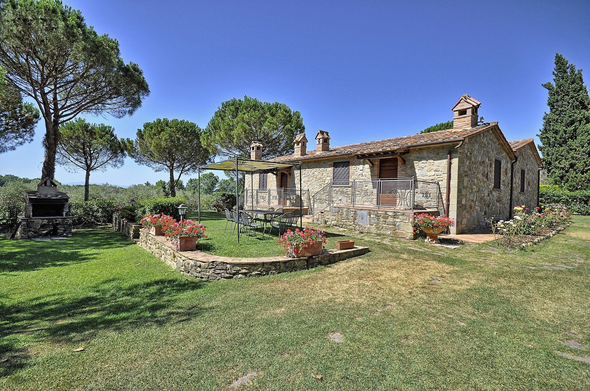 Ground Floor: small area in the garden furnished with a table, chairs and sun umbrella. Entrance into living area with operating fireplace, sofa bed (double size) and dining table, open space kitchen with gas hob, electric oven, coffee maker, fridge and freezer, bedroom with double bed and single bed, bathroom with shower.