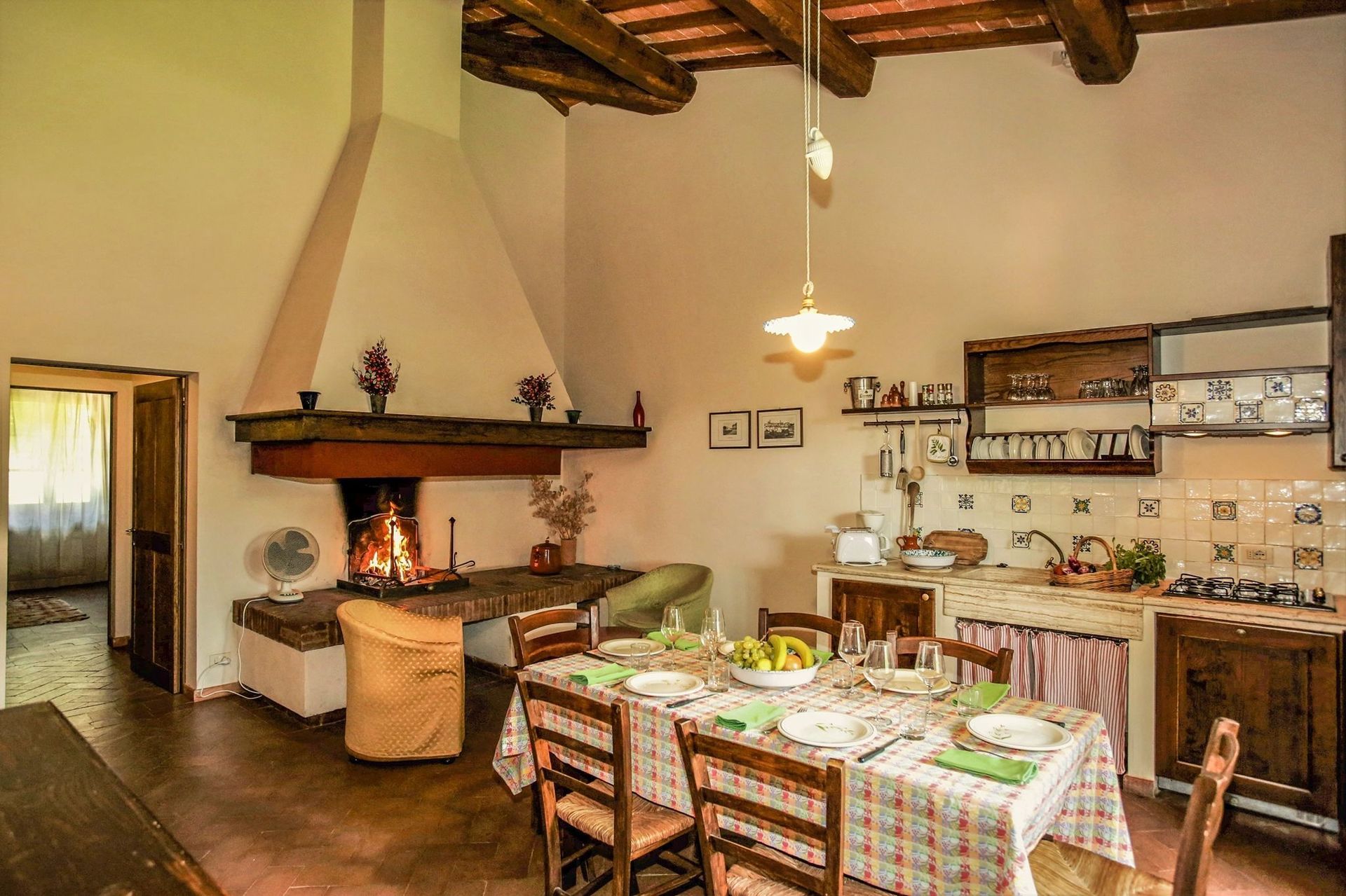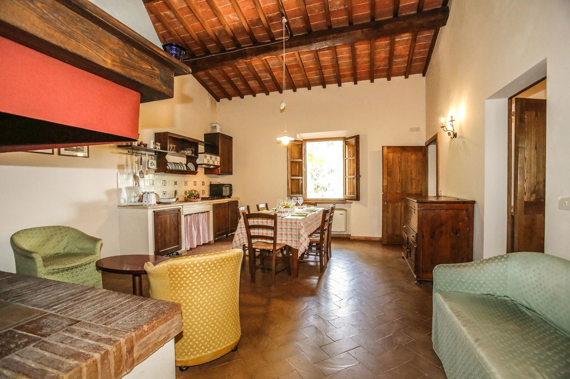 Kitchen + living room: well equipped kitchen, dining table (people: 6), dishwasher, fridge, stove top, oven, toaster, italian coffee machine, american coffee machine, sofa, armchair, fireplace, WIFI internet, satellite tv.