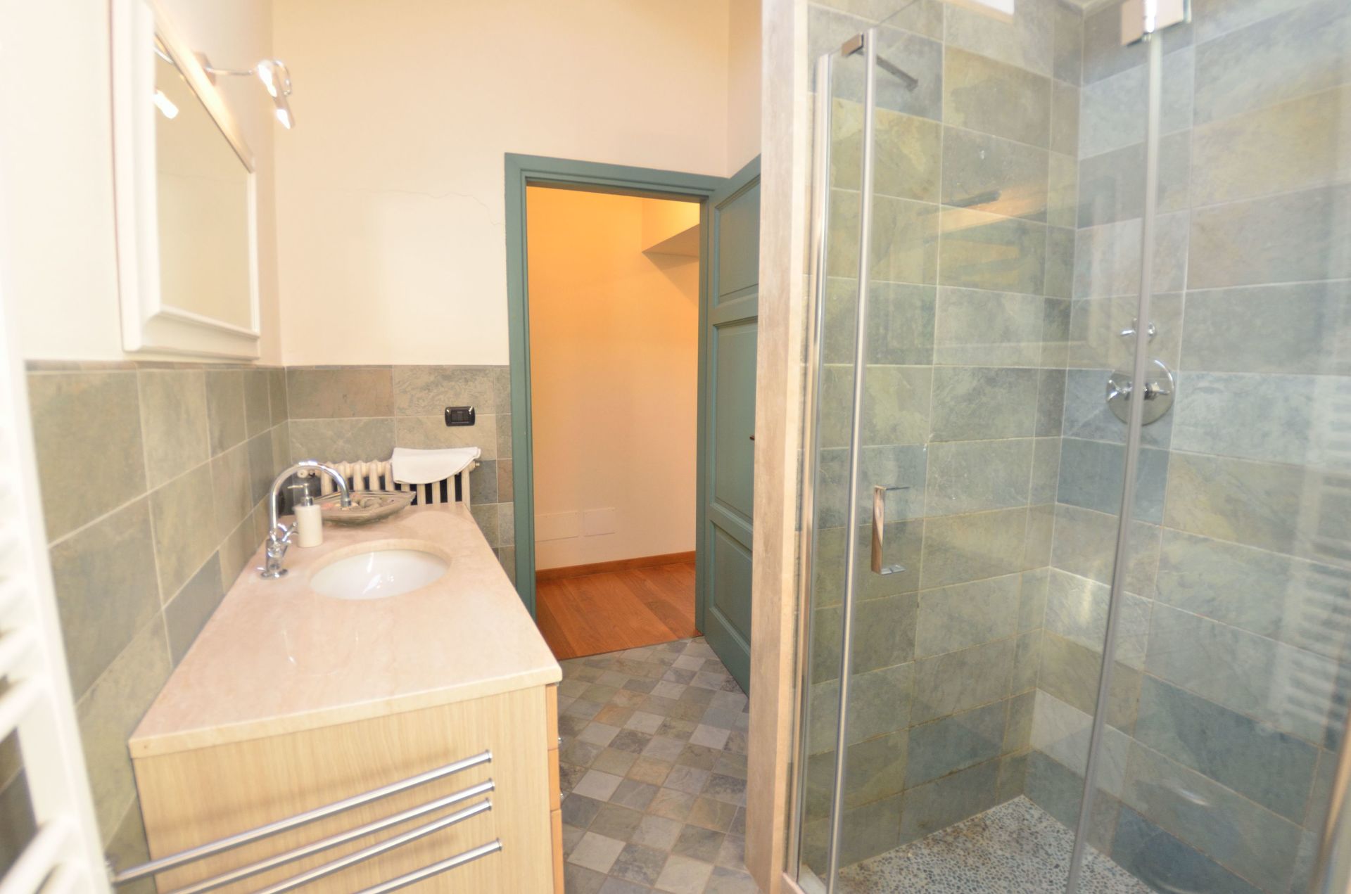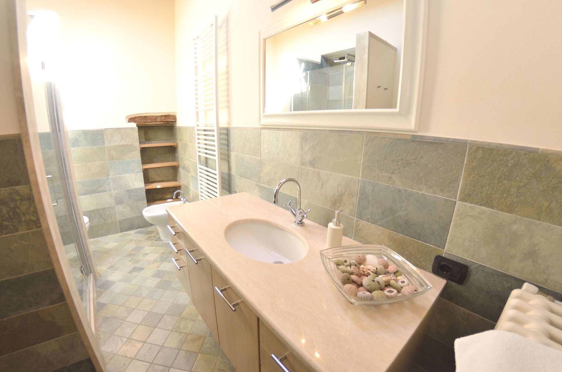 Bathroom: basin, toilet, bidet, shower.