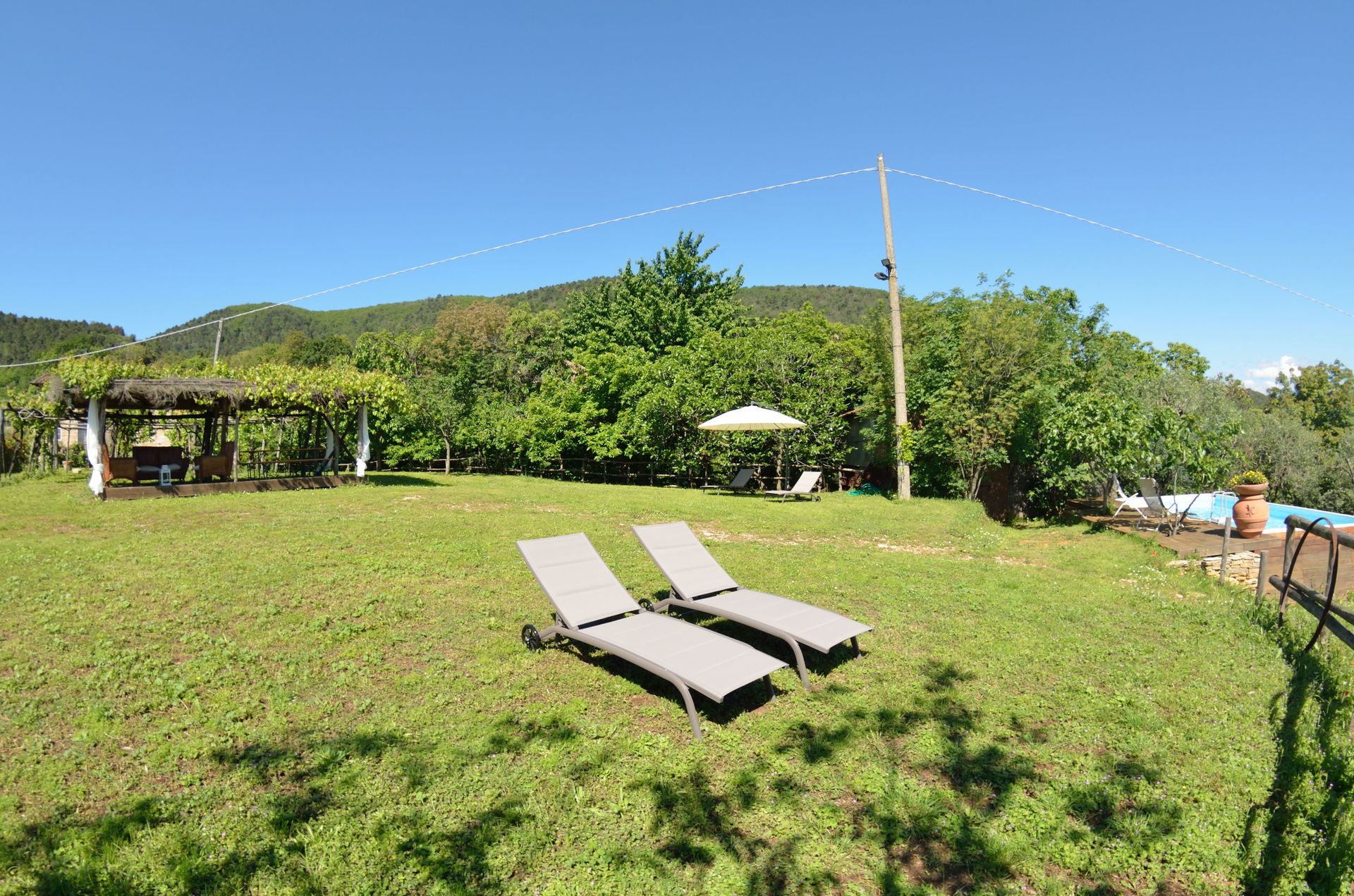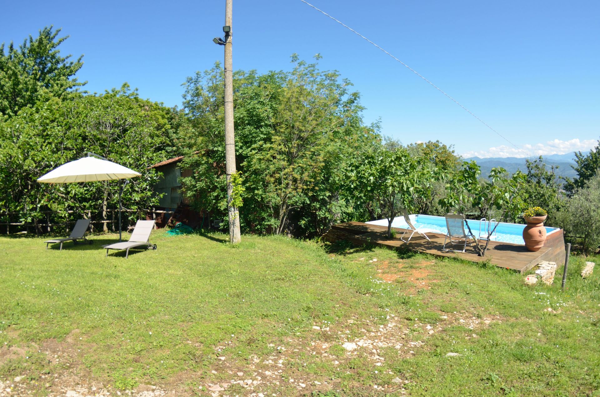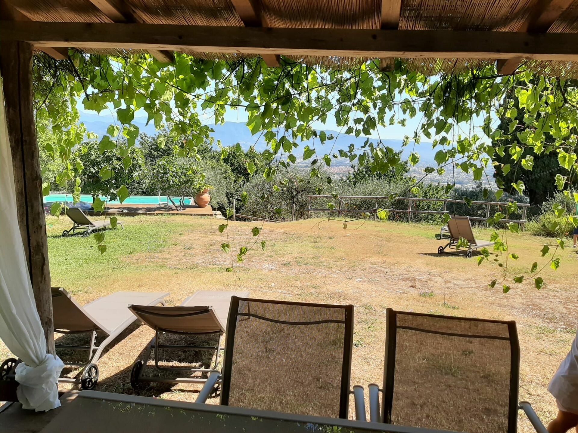 Die Lage ist sehr schön, auf einer Anhöhe gelegen, mit tollem Blick auf Lucca; das Gelände großzügig und gepflegt, mit Weinreben und Obstbäumen; der Pool, ist einfach, aber war zumindest für uns, vollkommen ausreichend zur Abkühlung; schöner, schattiger Lounge-Bereich mit Grillplatz und Strohüberdachung.