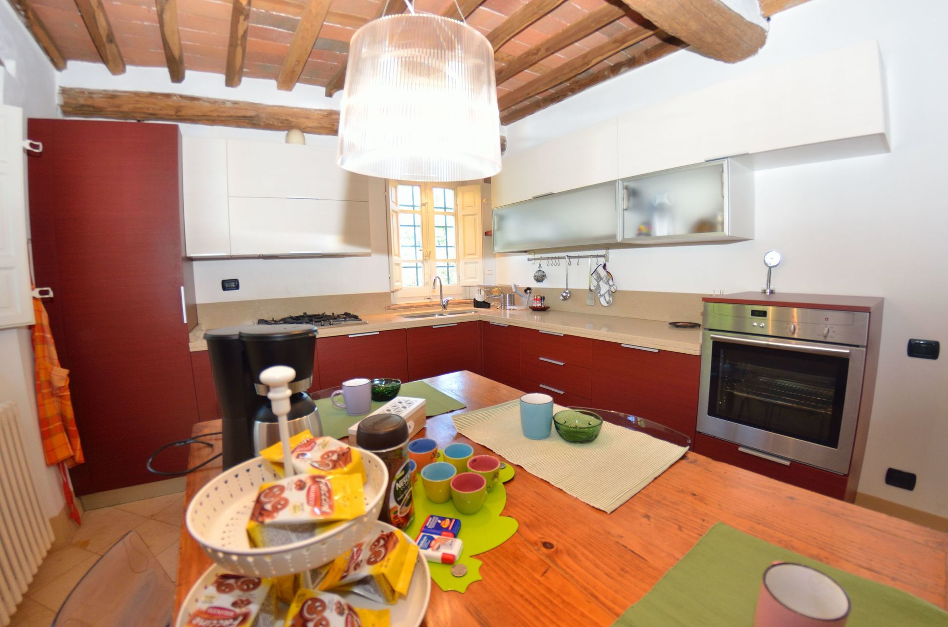 I piatti e i bicchieri sono doppi nel senso che sono presenti 2 serviti da 8, uno posizionato nella piattaia e l’altro nella vetrina a vista in cucina.