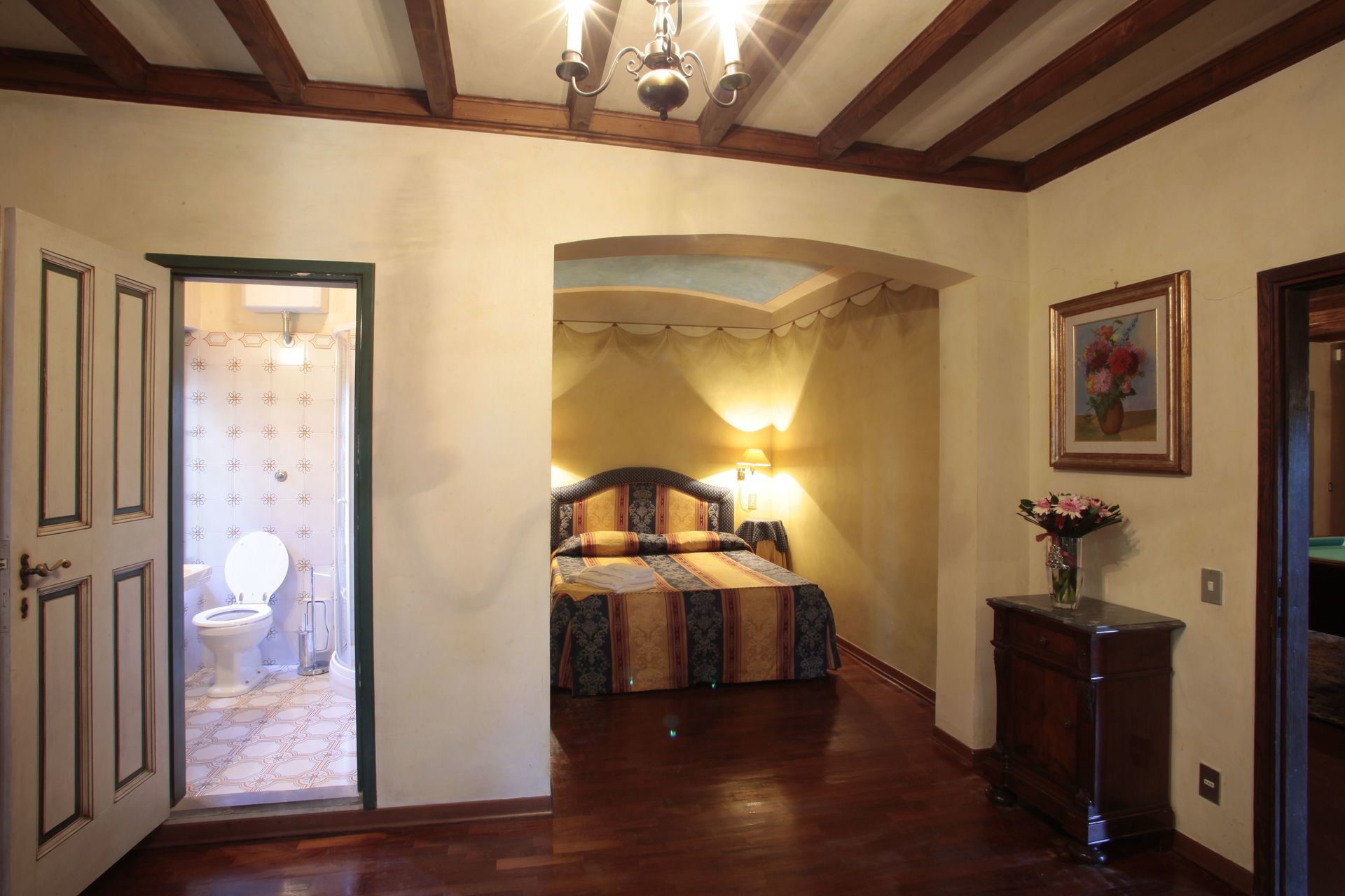 Milani 2 is a bedroom with a double bed and the en-suite bathroom with bathtub