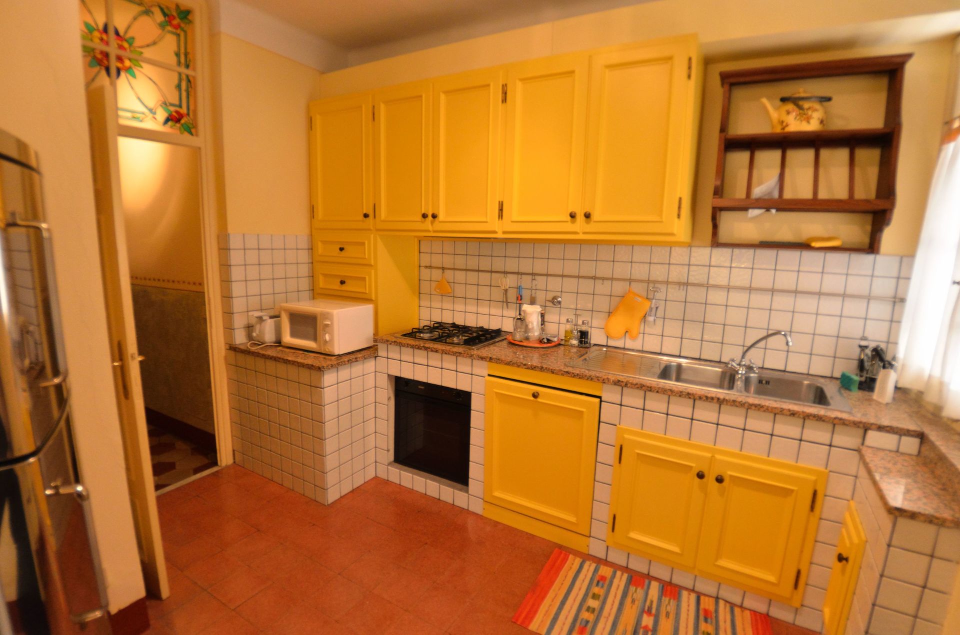 The flat lies on the 1st floor and is composed by: entrance, living room with sofa and armchairs, fireplace, TV with video,recorder, kitchen made of stones with stove, oven, fridge/freezer, dishwasher, dining room, 1 double bedroom, 1 twin bedroom, utility room, 1 bathroom with tube/shower, wc/bidet, big window door.