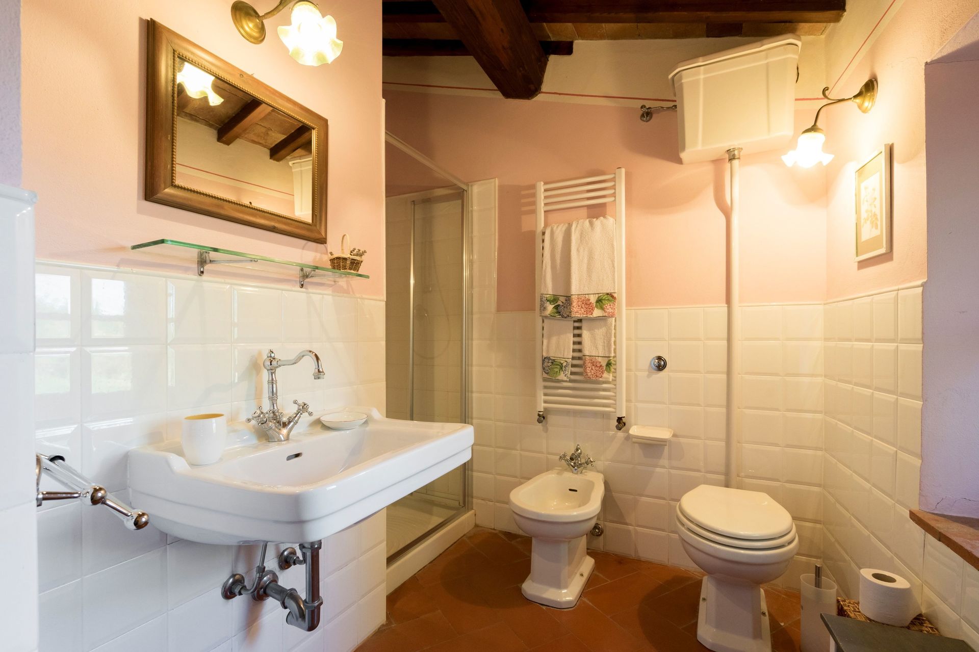 Bathroom: basin, toilet, shower.
