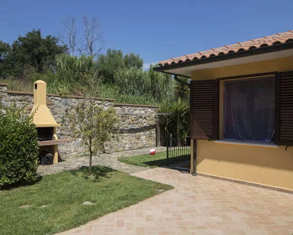 The exterior of villa "Serra" has been designed to maximize enjoyment of the surrounding natural environment. The fully fenced 100 square meter garden provides a generous and private outdoor space where guests can unwind in complete seclusion. Garden furniture is thoughtfully arranged throughout the yard, offering comfortable seating areas ideal for relaxing in the Tuscan sunshine. A barbecue is also available, making outdoor dining a natural and enjoyable part of the stay. The sunny orientation of the property ensures that the garden receives abundant natural light throughout the day, creating a warm and inviting atmosphere from morning to evening.