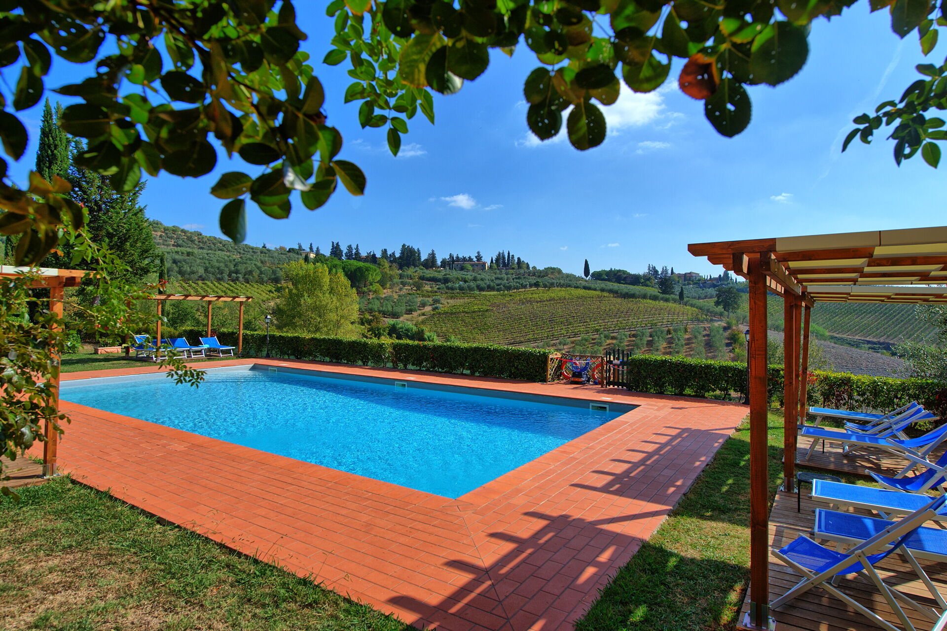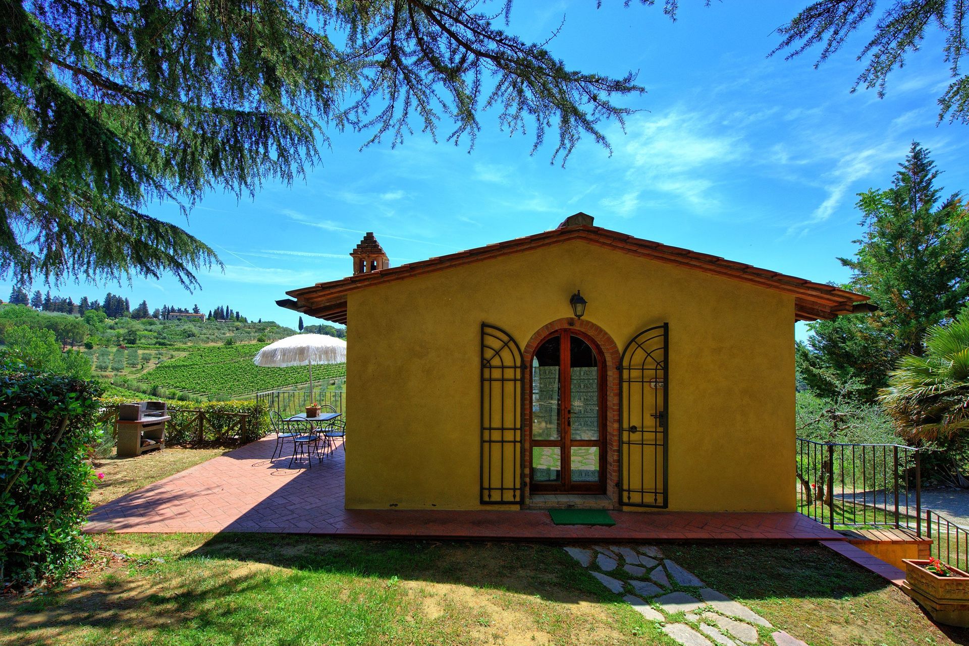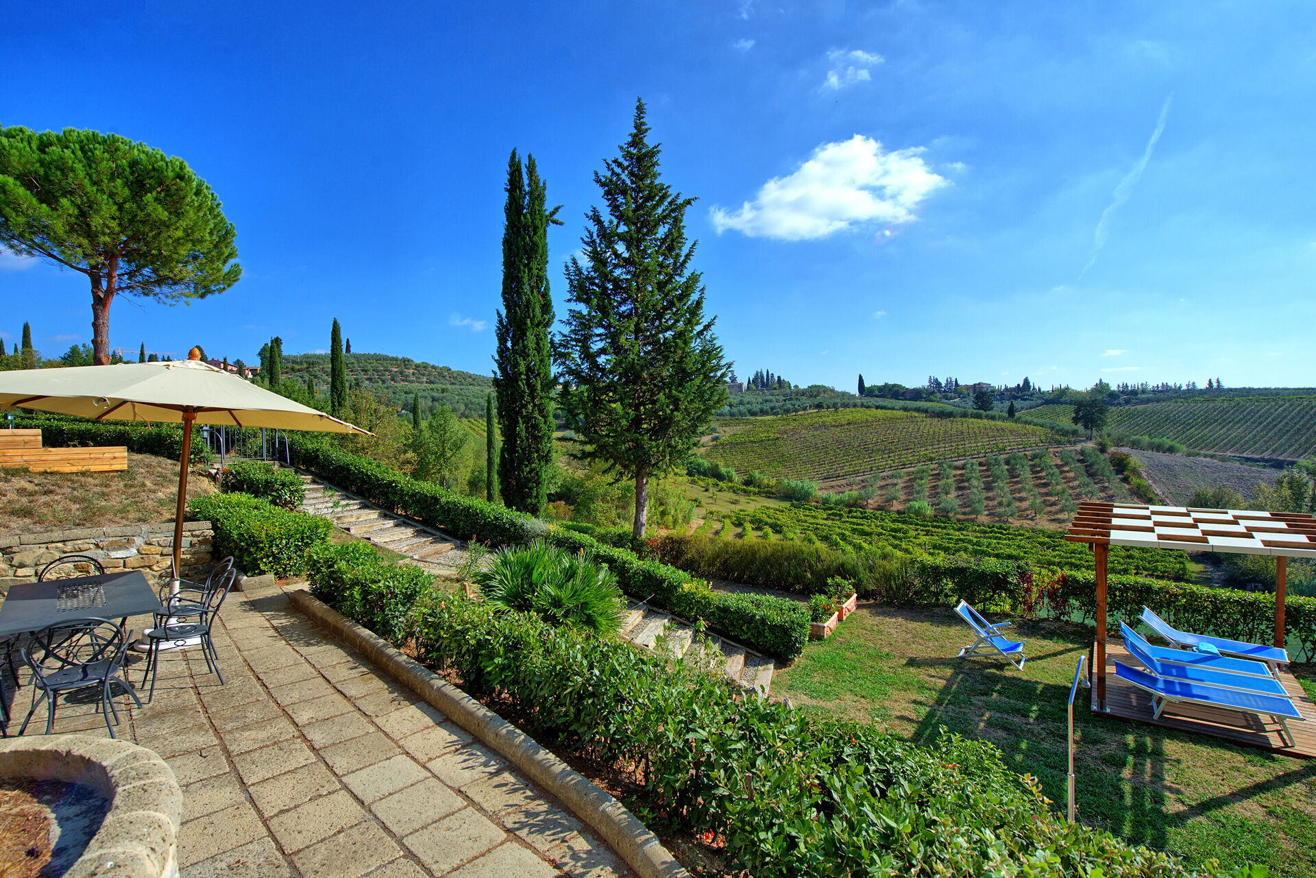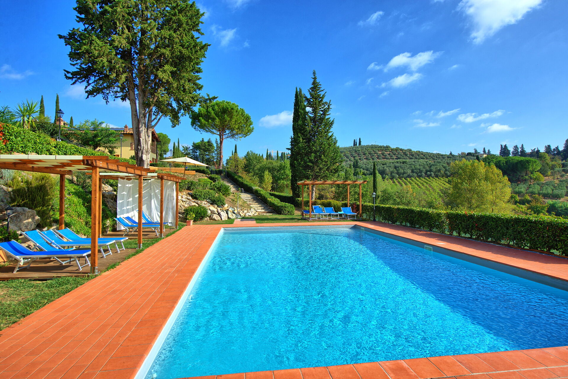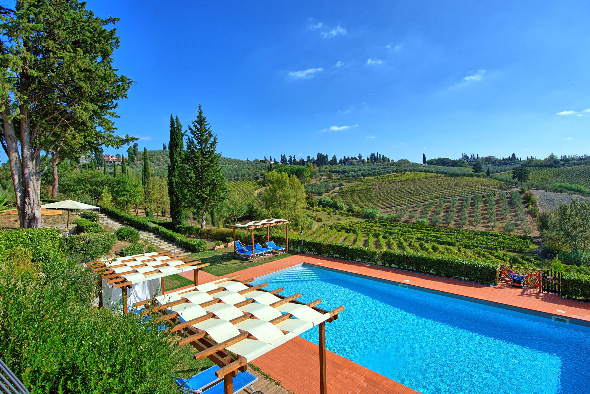 Every apartment has its independent entrance to guarantee privacy and peace to guests who stay there. A swimming pool is at guests' disposal as well as a wide garden to enjoy a beautiful panoramic view over the countryside of the Chianti Area.