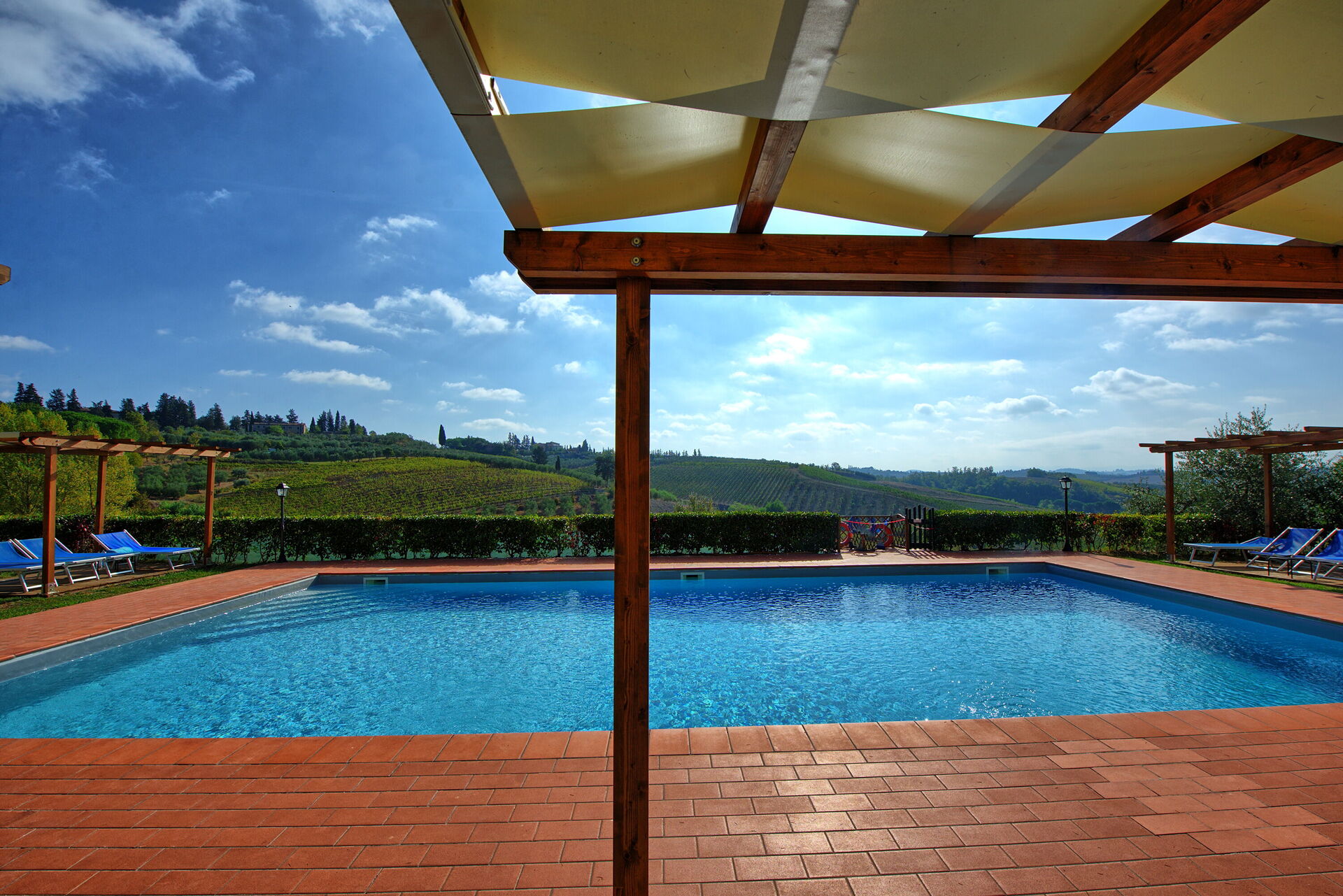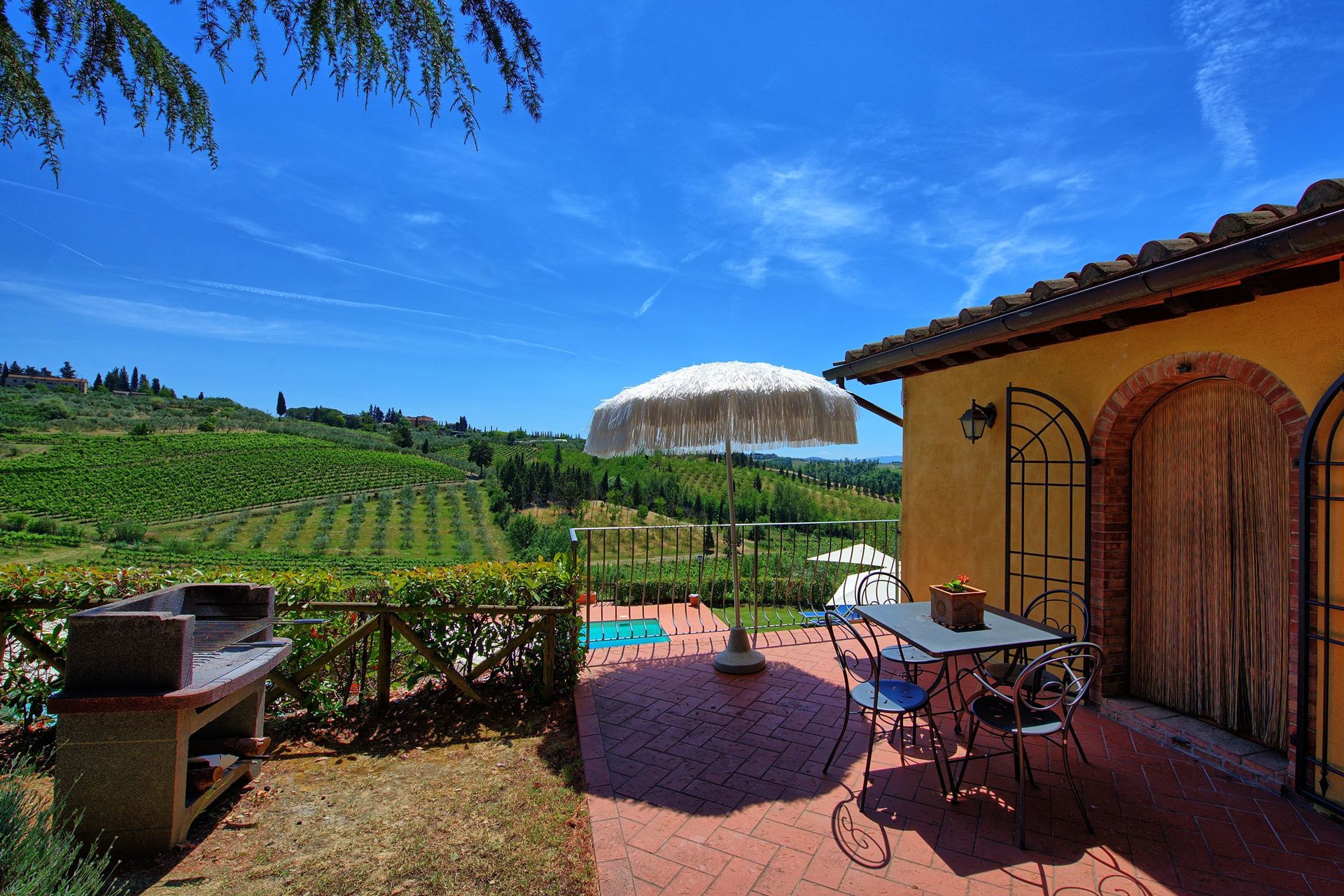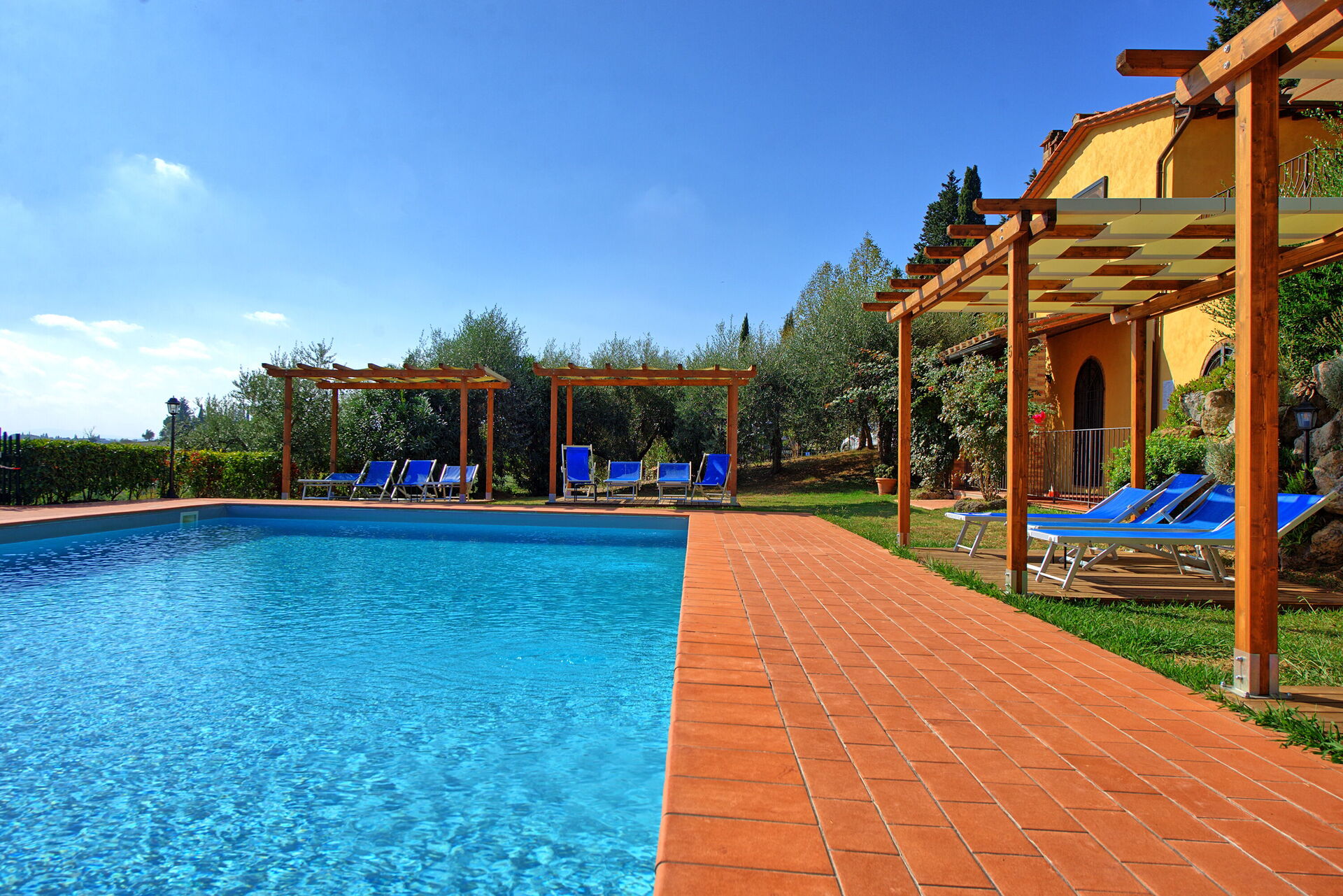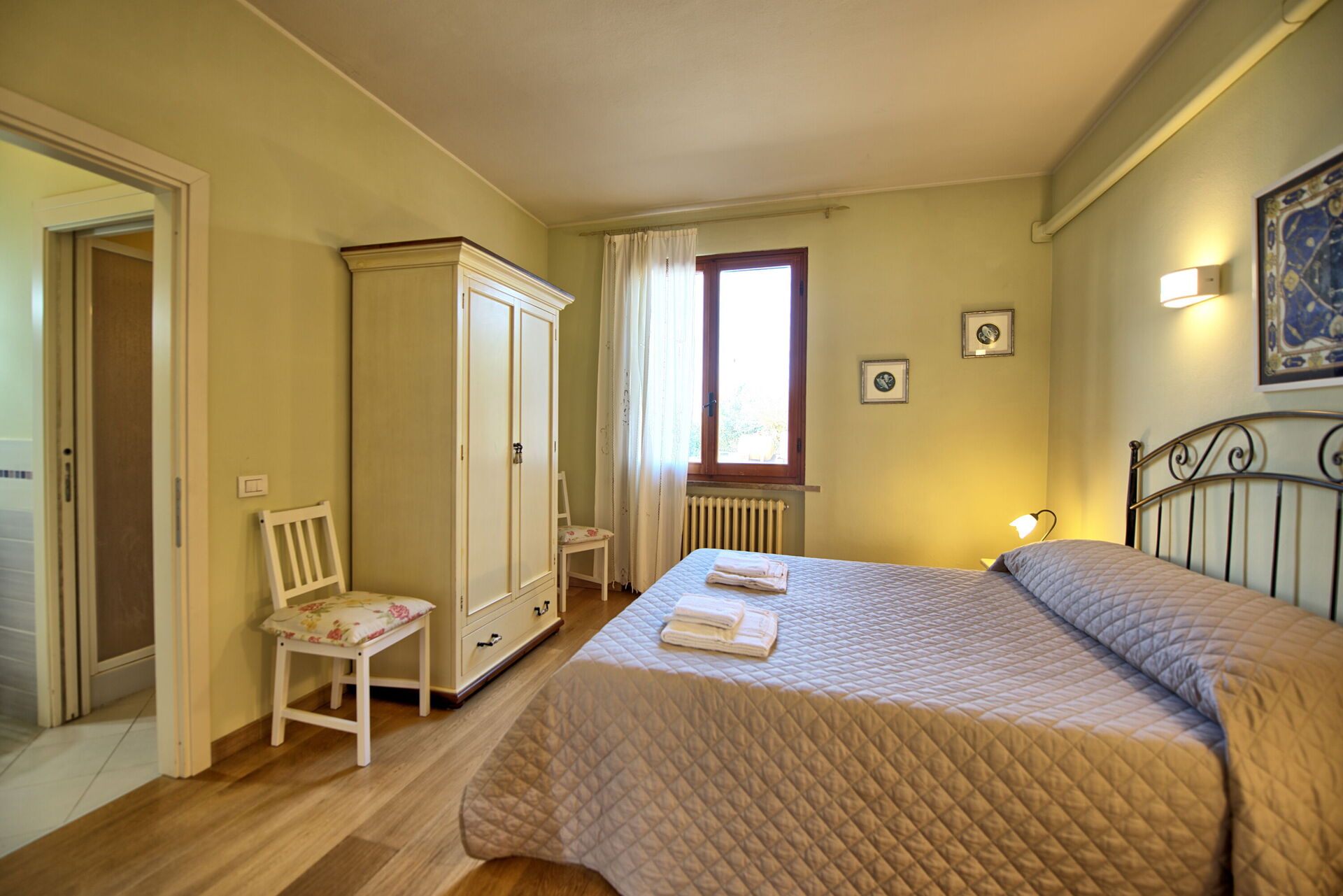 Every apartment has its independent entrance to guarantee privacy and peace to guests who stay there. A swimming pool is at guests' disposal as well as a wide garden to enjoy a beautiful panoramic view over the countryside of the Chianti Area.