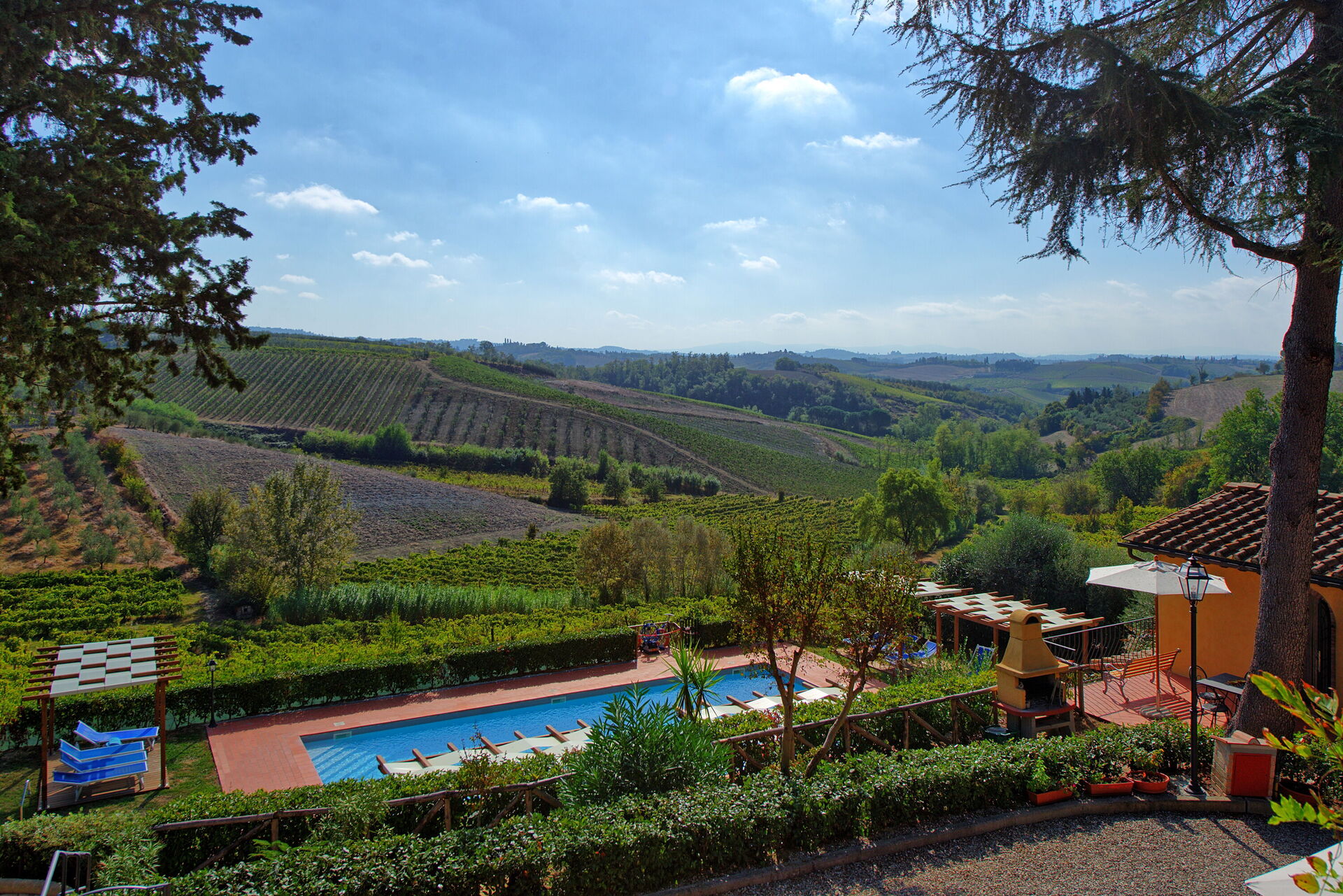 De pluspunten: Het uitzicht is schitterend! 4 zeer ruime appartementen met ieder 3 slaapkamers en 2 badkamers. Bedden zijn hard, maar sliepen prima. Kies bij voorkeur beneden appartement koeler en terras voor de deur. Boven heel smal balkon (nr 7) onderaan trap wel terrasje met tafel maar ga je niet snel zitten. Mooi zwembad met voor iedereen een ligbed/stoel en parasol. Binnen 10 minuten in Certaldo met hele mooie nog niet erg toeristische oude stad, je zit ook direct aan de Chianti wijnroute, steden als Florence, San Gimignano en Siena zijn binnen een uur bereikbaar. Eigenaren zijn vriendelijk en spreken perfect Engels (hebben in USA gewoond).