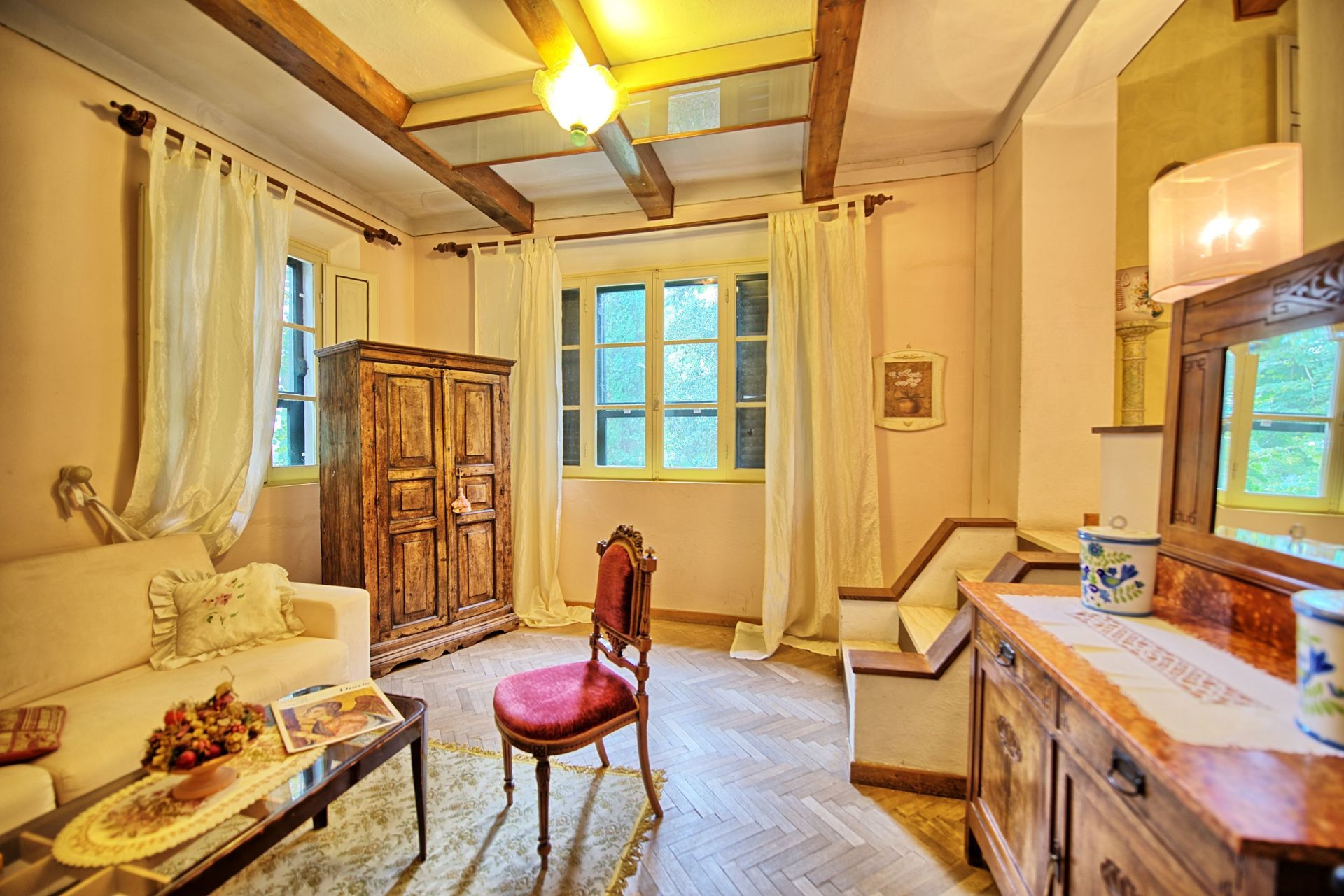 1st floor: large double bedroom, parlour with fireplace and double sofa-bed, dress-room, double bedroom, bathroom with tub.