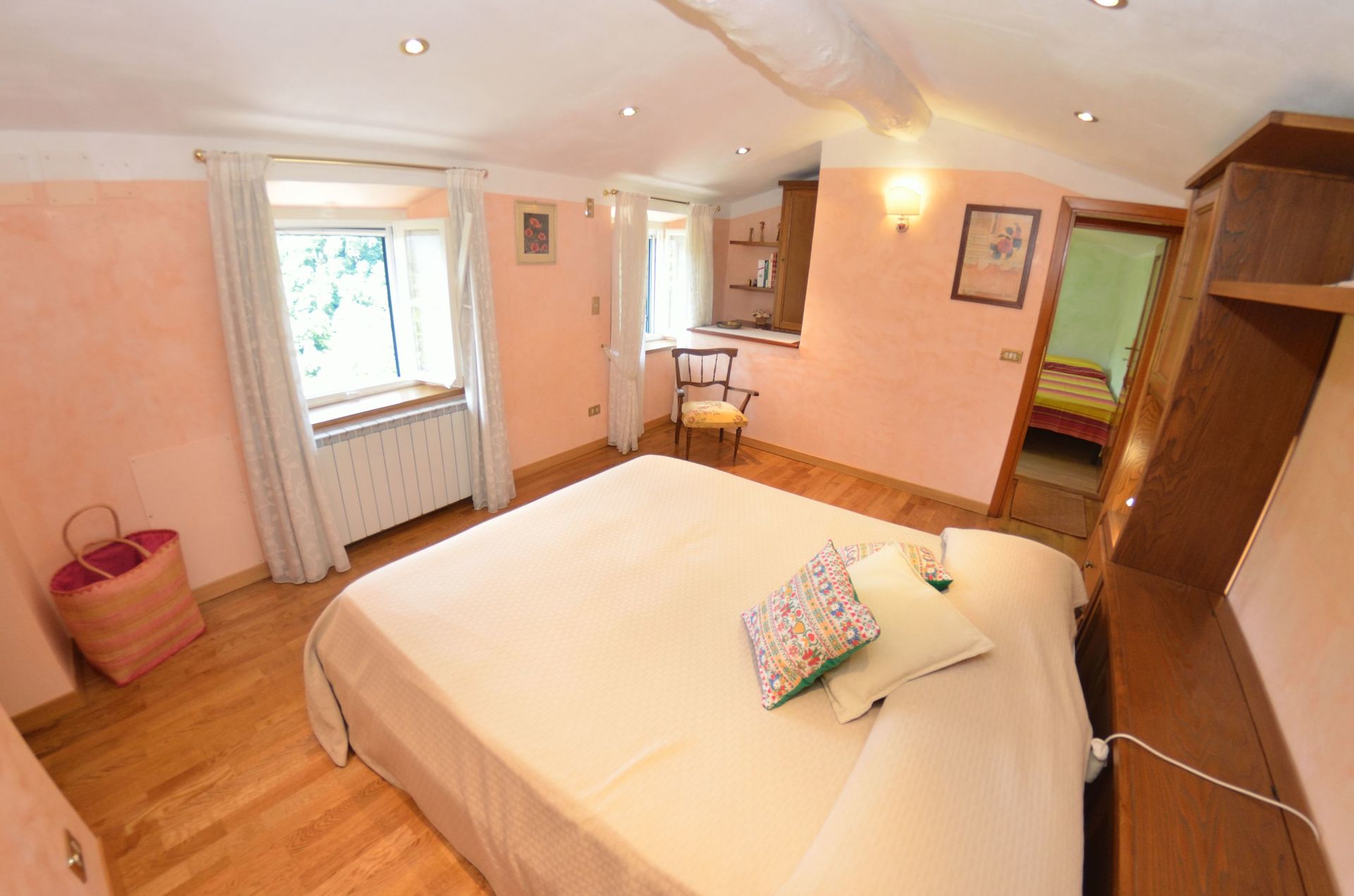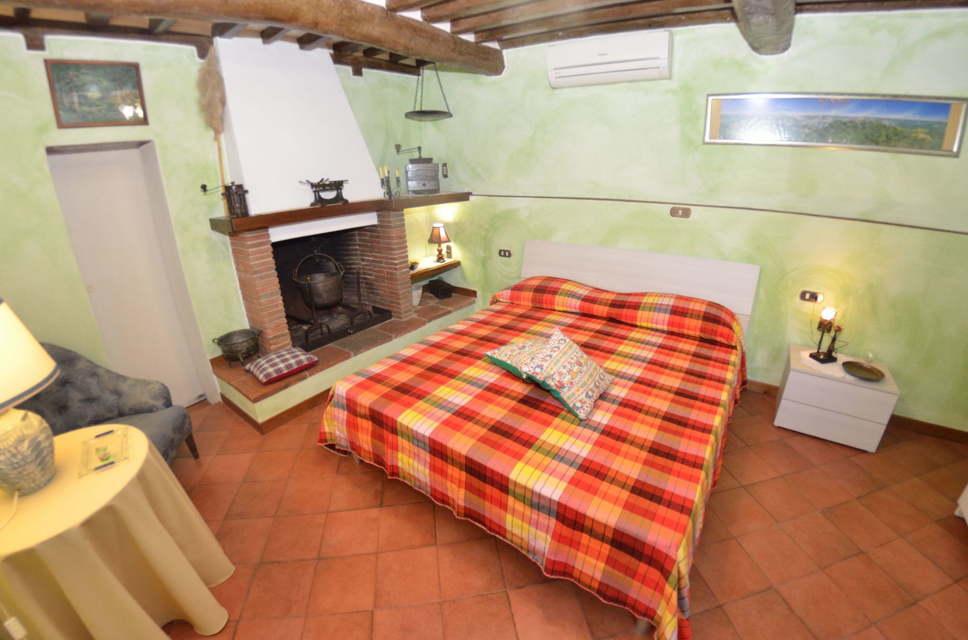 Bedroom 1: double bed, armchair, fireplace.