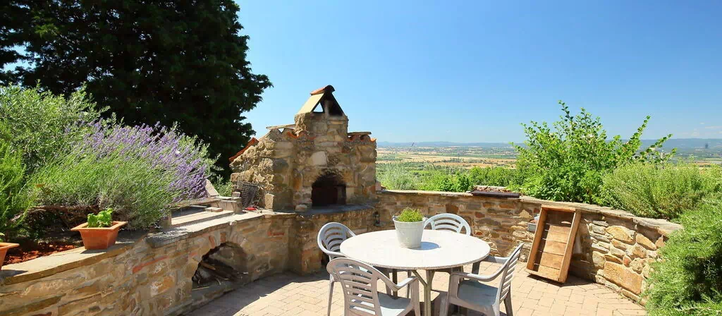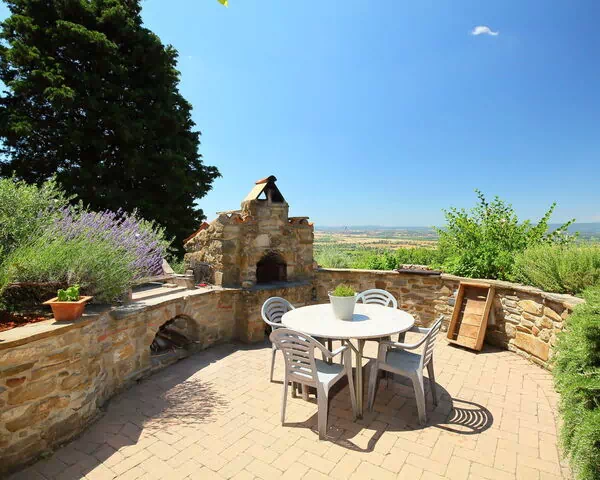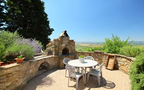 Sant'Andrea a Pigli 10 km from Arezzo: The house Domivecchi renovated in Tuscan style offers a unique and evocative. The property is located in Sant'Andrea a Pigli, in the municipality of Arezzo, in a hilly area on the slopes of the natural park of Monte Lignano. The house is surrounded by olive groves with panoramic views over the countryside of the Valdichiana and Mount Amiata. Very old semi-detached house "Domivecchi", 300 m a.s.l., surrounded by meadows and fields. 10 km from the centre of Arezzo, 20 km from the centre of Cortona, 80 km from the centre of Firenze, in a sunny position on top of a hill. Private: garden 200 m2 (fenced), orchard. Arbour, garden furniture, barbecue. In the house: central heating system, washing machine. Room cleaning on request (extra). Cook on request (extra). Parking at the house. Grocery 800 m, restaurant 2 km, bus stop 800 m, railway station 10 km, outdoor swimming pool 10 km. Nearby attractions: Civitella in Val di Chiana 20 km, Monte San Savino 23 km, Rapolano Terme 45 km, Siena 65 km.