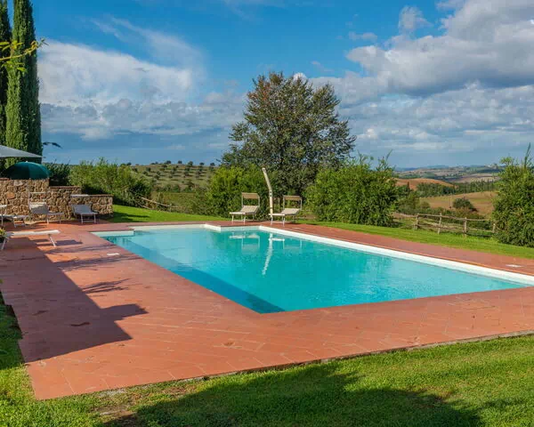 The outdoor spaces of this property are as generous as they are beautiful, inviting guests to make the most of the Tuscan countryside at every hour of the day. The private grounds extend across 1,500 m2 and include a well-maintained garden, which, while not fenced, offers a natural and open sense of space framed by the surrounding landscape. The centrepiece of the exterior is the impressive swimming pool, measuring 14 x 7 m with a depth ranging from 90 to 140 cm and equipped with an internal staircase for easy access. The pool is available seasonally from 30 May to 1 October. A spacious terrace adjoins the outdoor area and is furnished with garden furniture, providing an ideal setting for al fresco dining and leisurely afternoons in the sun. A barbecue is also available, perfect for preparing meals outdoors while enjoying the panoramic views from this hilltop position.