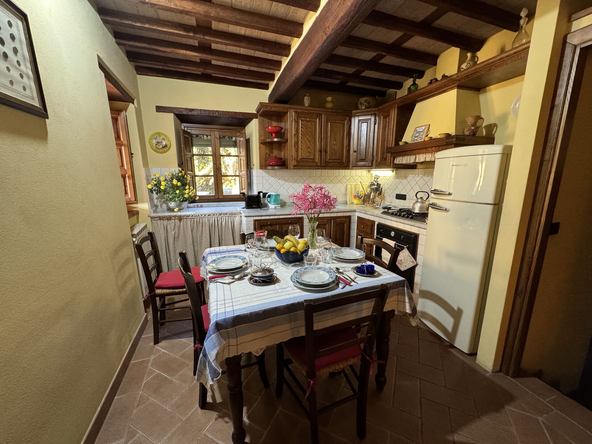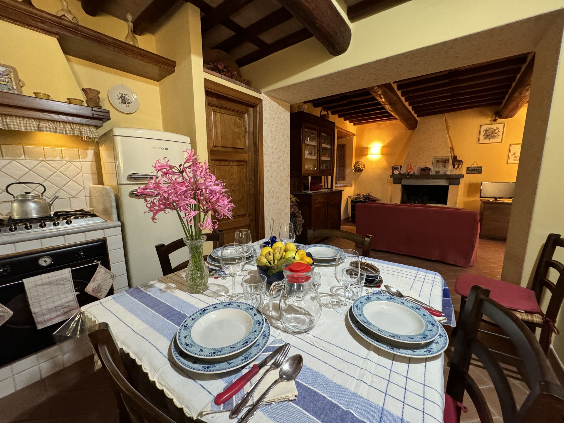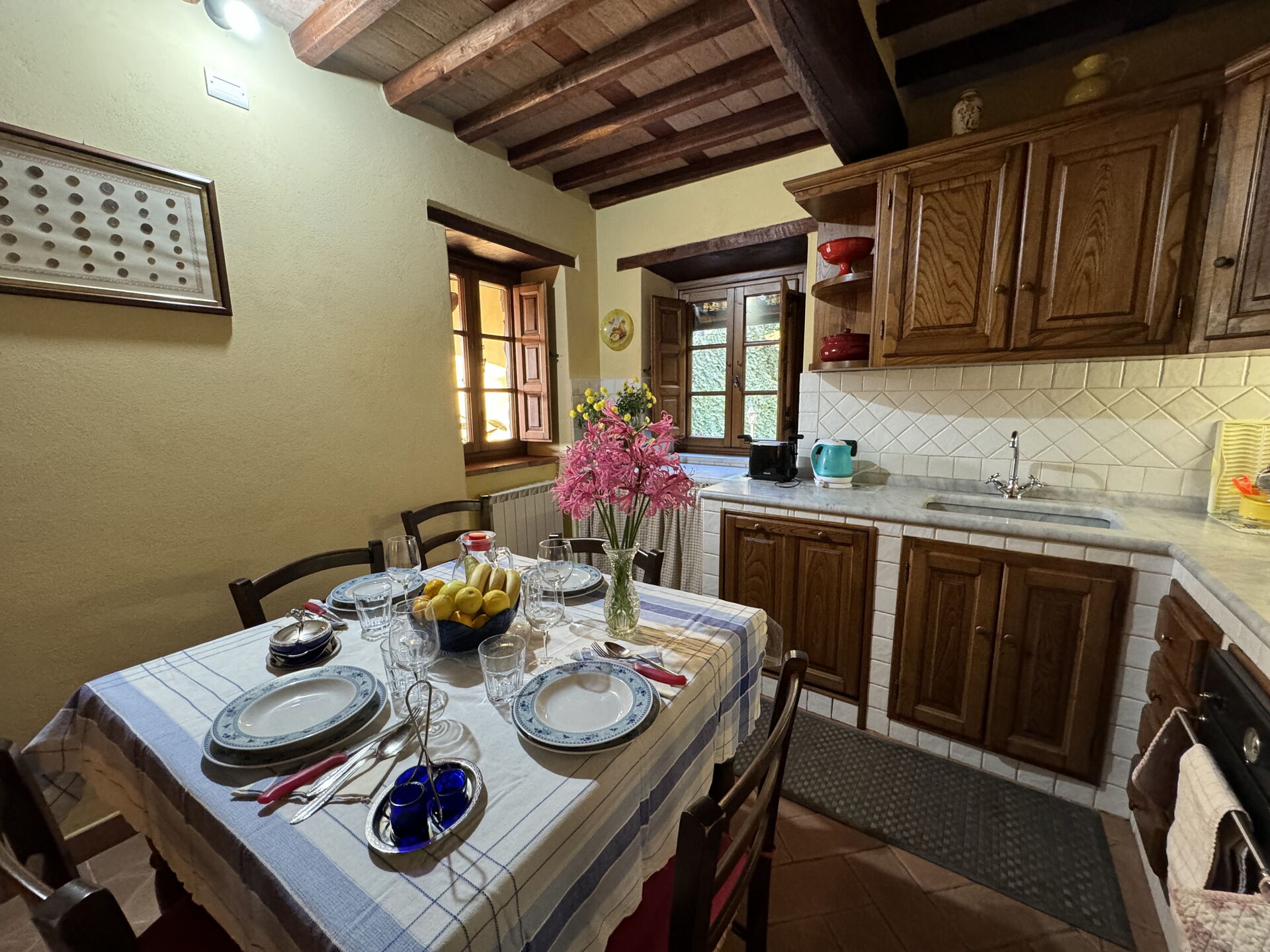 When you arrive at Batticapo di Ilaria you’ll find a beautiful clean well-maintained property with views of the hills ideal for a peaceful vacation in Tuscany. Regardless of how you spend your days - visiting museums, sightseeing, shopping or just driving in the countryside, when you arrive home you can unwind with your family and friends at the pool for a perfect ending to another day in Tuscany. Sharing a meal with friends and family is a big part of the Tuscan culture. Take advantage of the kitchen to prepare meals using local produce while on your holiday. The kitchen includes coffee machine, stove and refrigerator, as well as, plenty of tableware and cutlery for up to six people. Dine 'al fresco' like a real Tuscan, the fully furnished garden is the perfect setting to enjoy food, family and the lovely Tuscan weather.