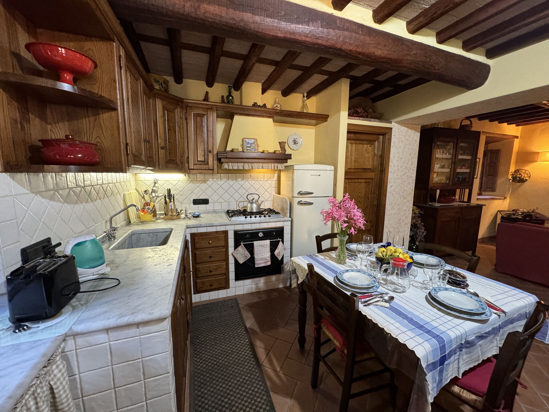 Kitchen: dining table (people: 6), dishwasher, fridge, freezer, stove top, oven, italian coffee machine.