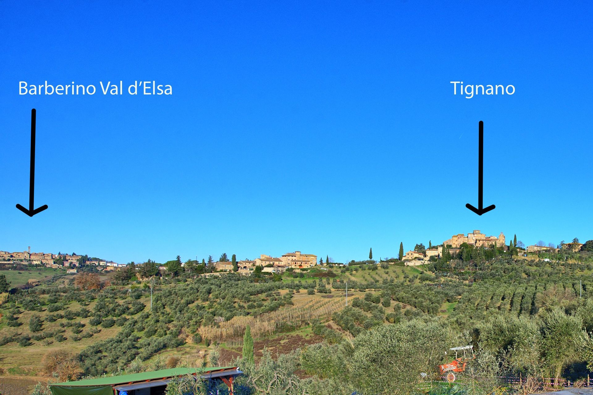 Distances: Tignano 800 m, Barberino Val d'Elsa (shops of any kind) 4 km, San Gimignano 25 km, Florence 40 km, Siena 42 km, other sites within a range of 10-40 km on the Chianti Hills such as Castellina, Greve, Panzano, Gaiole; Montalcino 77 km, Pienza 90 km, Arezzo 95 km, Montepulciano 100 km, Cortona 115 km.