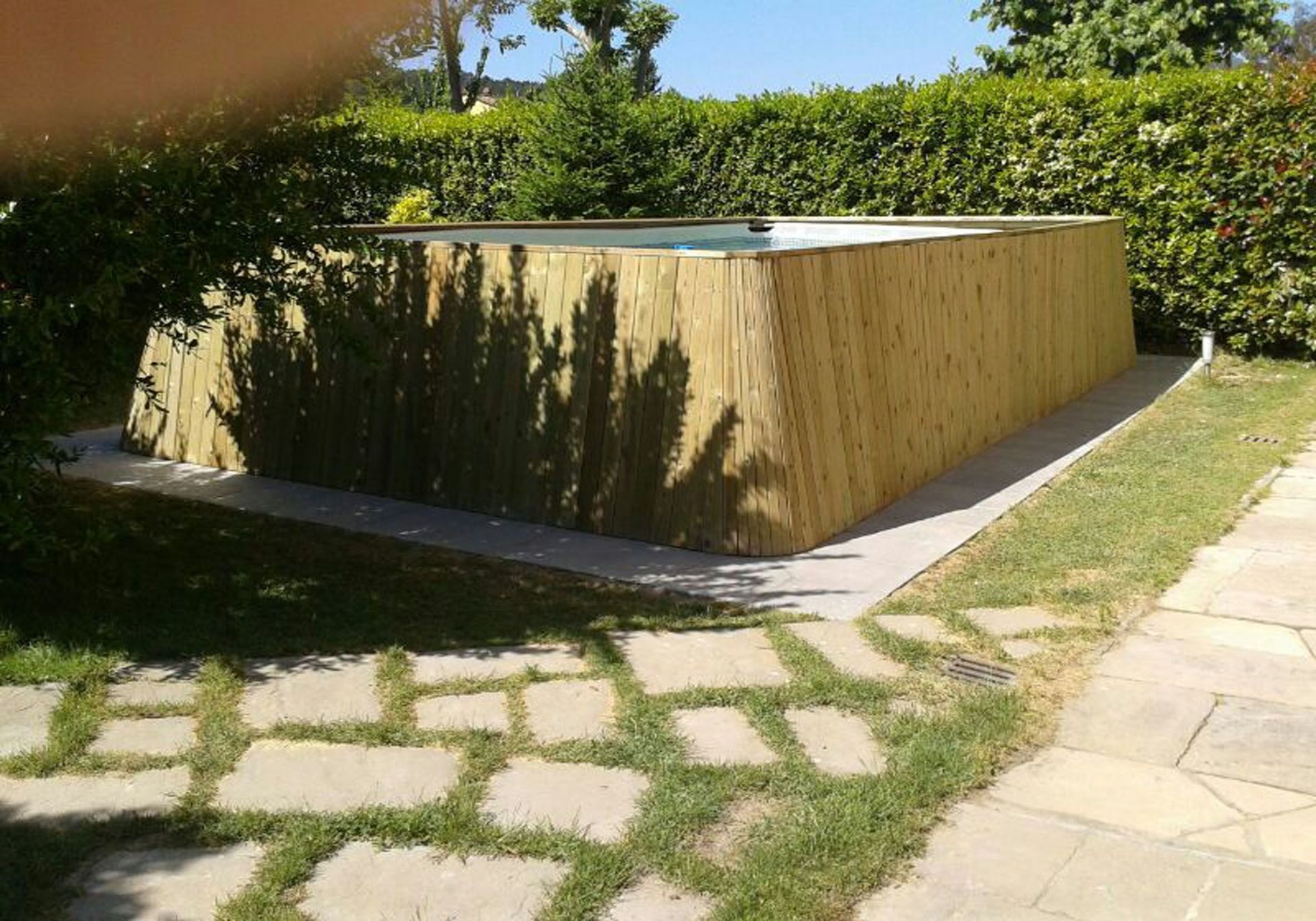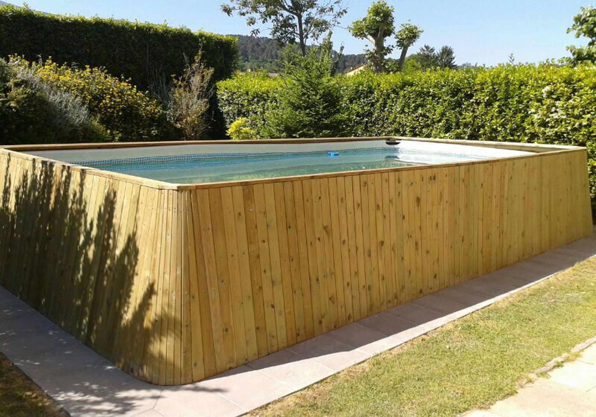 Garden: swimming pool (private, length: 6m, width: 8m, depth: 1.3m, max. depth: 1.3m, outdoor), al fresco dining, dining table (people: 8), garden furniture, four sunbeds, fenced, enclosed property.