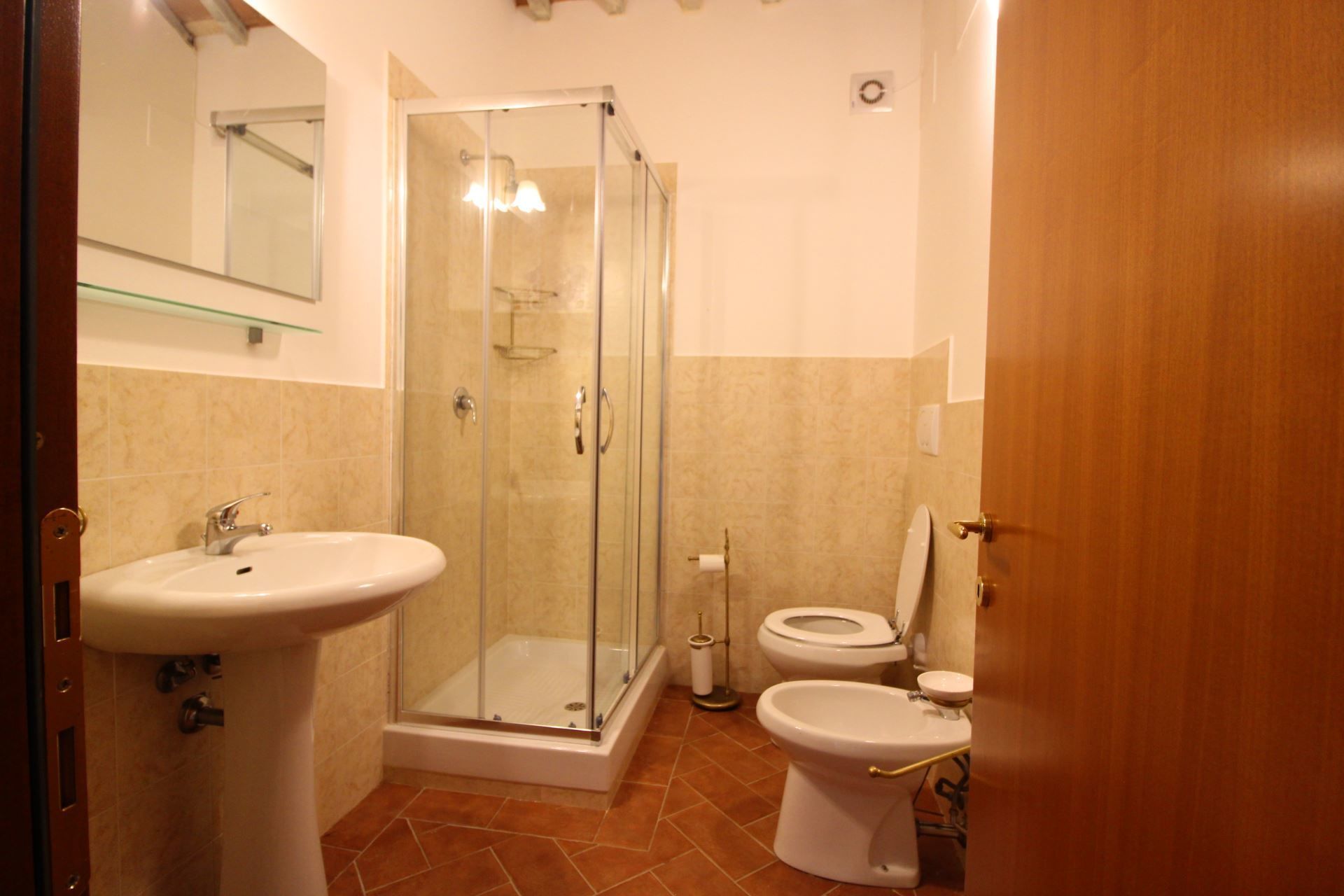 Apartment 1, GROUND FLOOR. Entrance on living-dining room with kitchen corner equipped to have meals altogether, sofa and TV, double bedroom, bedroom with bunk bed, bathroom with shower suitable for disabled persons and double bedroom with private bathroom with shower.