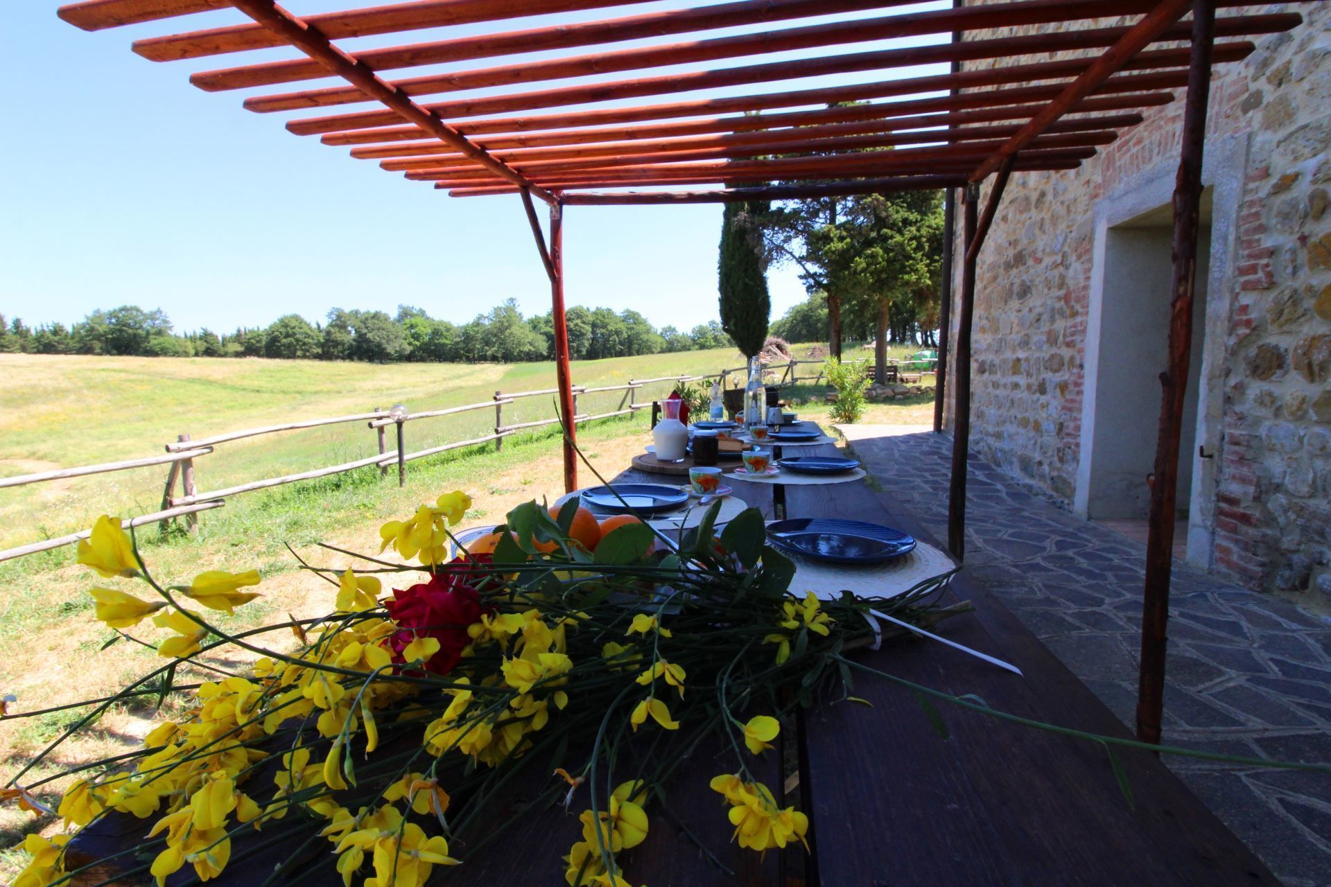 Restaurant and activities. Around 500 meters far, and part of the Azienda, we find the restaurant Poderuccio, where you can live an experience of taste, flavor and authenticity, as all ingredients used are organic, fresh in season and strictly of their own production or farm-to-table. At Poderuccio the owner, in addition to cooking classes with the products of the synergistic garden, which produces vegetables without the use of fertilizers and with the technique of mulching, also organizes yoga classes in the adjoining room and in the covered outdoor patio. For those who like to walk, a short path in the woods connects Podere Palazzone to the restaurant.