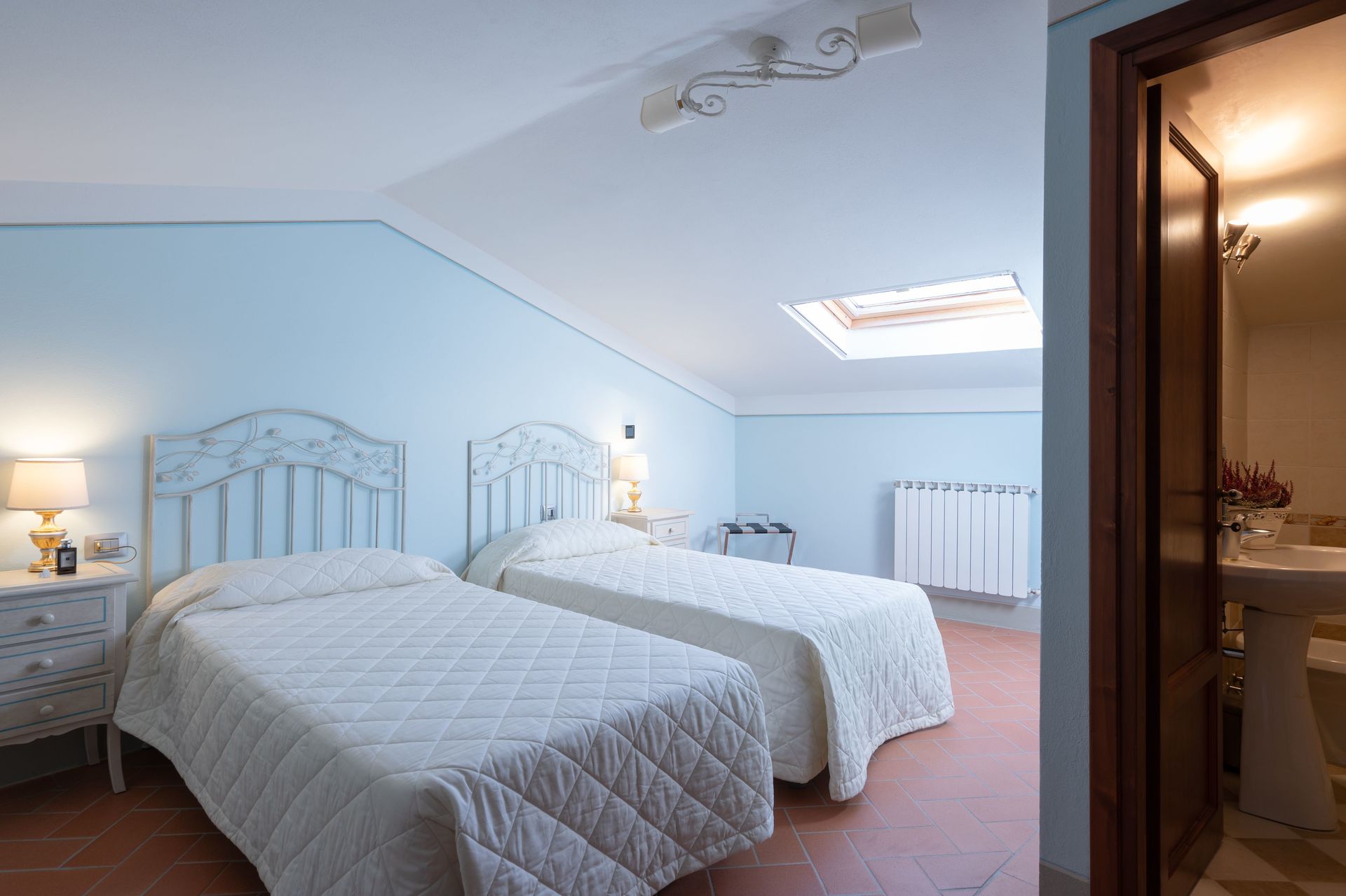 Bedroom + Ensuite Bathroom 1: two single beds, mosquito net, basin, toilet, bidet, shower.