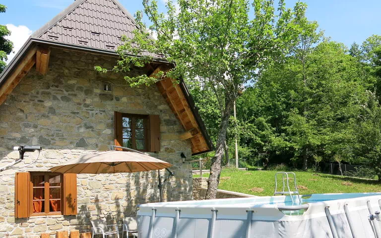 The property boasts a private natural state land of 500 square meters, fenced and featuring a terraced garden with trees and a meadow. Guests can take a refreshing dip in the above-ground swimming pool measuring 5 x 3 meters with a depth of 130 centimeters, available seasonally from May 15th to October 15th and maintained by the owner/gardener. The terrace with garden furniture offers a delightful outdoor space to relax and soak in the beautiful surroundings.
