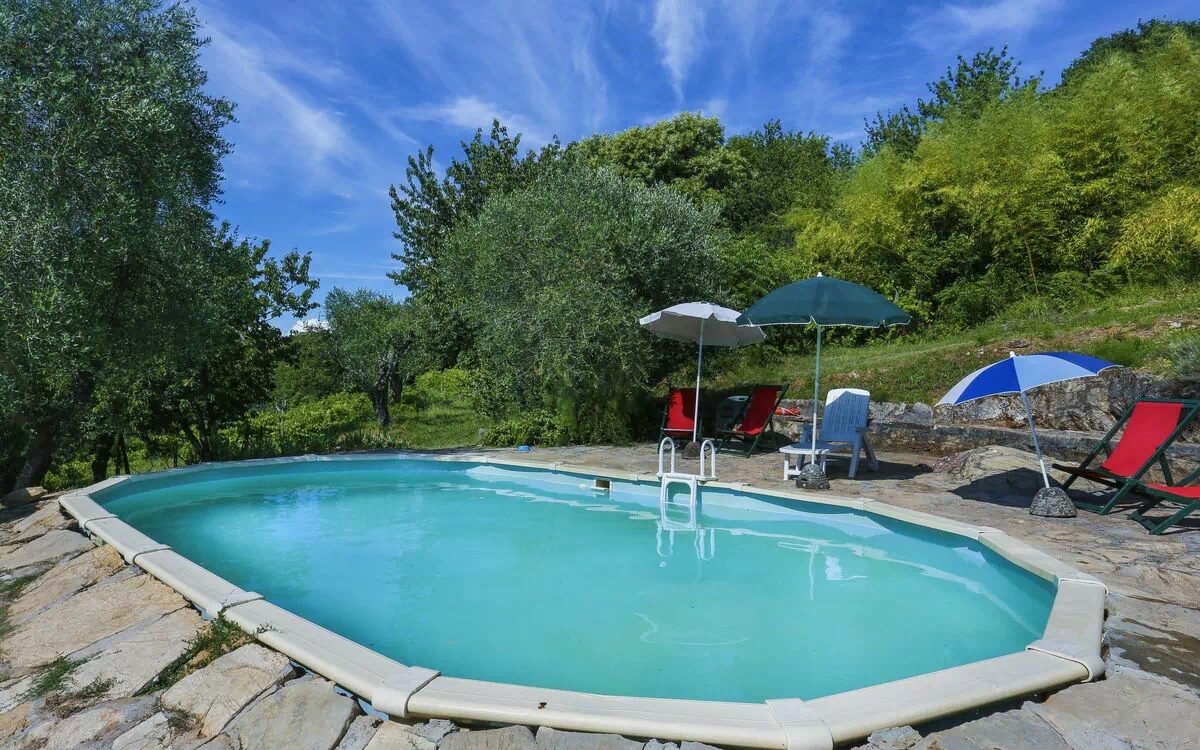 The outdoor spaces at "Belvedere" are thoughtfully arranged to make the most of the property's elevated countryside setting. The kidney-shaped swimming pool, measuring 8 x 5 metres, is the centrepiece of the exterior and is available seasonally from 1 May to 30 September. Adjacent to the pool, a fully equipped pool house provides practical amenities including a fridge and a cooking stove, making outdoor living both comfortable and convenient. A pergola offers a shaded retreat for relaxing during warm Tuscan afternoons, while the terrace provides an ideal setting for outdoor dining and socialising. Garden furniture is available throughout the exterior spaces, and a barbecue is on hand for alfresco meals in the open air. The surrounding natural property of 7 hectares, featuring trees, meadow, and an orchard, creates a verdant and private backdrop that enhances the overall outdoor experience.