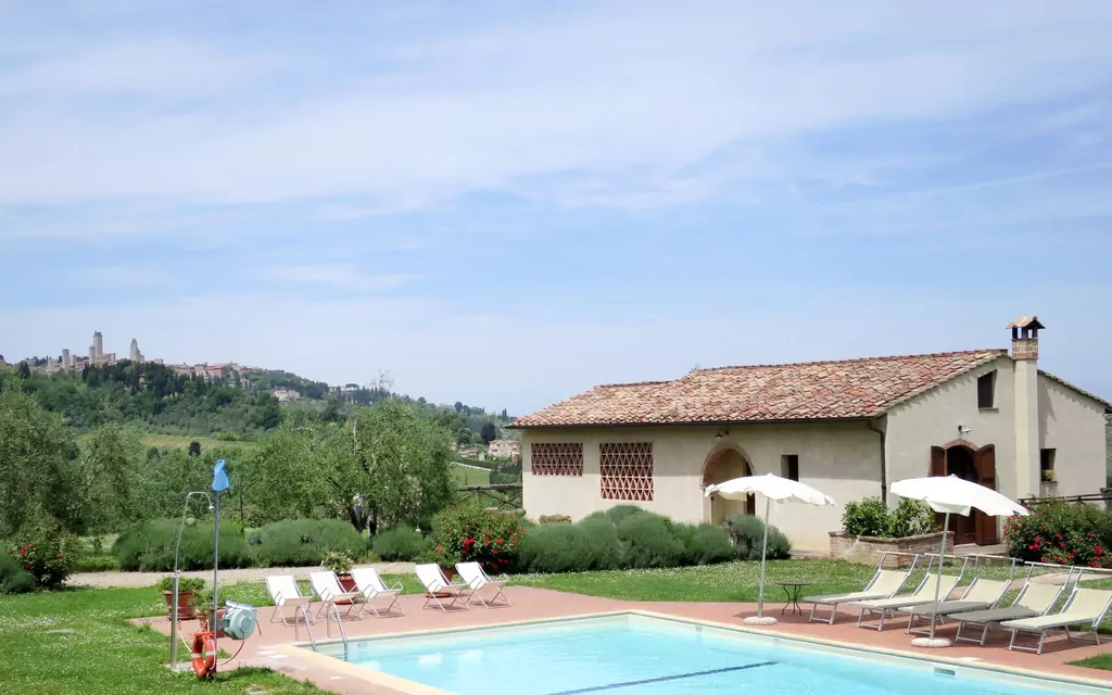 Nestled in the picturesque district of Santa Lucia, the villa known as "Le Fonti di Santa Lucia" is a stunning detached holiday rental set in the heart of the Tuscan countryside in San Gimignano, Italy. Elevated on a gentle slope and surrounded by rolling meadows and vineyards, this property offers a secluded and tranquil retreat that perfectly captures the essence of rural Tuscany. The villa sits within a beautifully maintained and fully fenced yard of 3,000 m2, adorned with colorful flowers, mature trees, and a charming natural pond, creating a serene and private atmosphere for guests seeking an authentic countryside escape. A large swimming pool measuring 14 x 6 m is available seasonally from 25 April to 10 October, providing a refreshing focal point for warm summer days, with pool maintenance handled directly by the owner and gardener. Guests benefit from reliable internet WiFi access throughout their stay, ensuring seamless connectivity without compromising the peaceful rural setting. For those arriving by car, a roofed parking area conveniently located at the house accommodates up to 4 vehicles, making arrivals and departures effortless for larger groups or families.