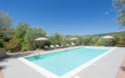 Nestled in the picturesque Tuscan countryside of Civitella In Val Di Chiana, Italy, Le Terrazze is a charming rustic two-storey terraced house that offers an exceptional vacation rental experience for those seeking tranquility and authentic rural character. Set on a generous 2-hectare lot, the property is fully fenced and encompasses a private area of 600 square meters, ensuring both privacy and security for all guests. The beautifully maintained garden features a lush lawn shaded by mature trees, creating a serene natural setting that perfectly complements the surrounding landscape. A large seasonal swimming pool measuring 12 x 5 meters invites guests to relax and refresh during warm days, while the expansive yard provides ample space for outdoor leisure and recreation. Reliable internet Wi-Fi is available throughout the property, allowing guests to stay connected with ease, and convenient on-site parking ensures a hassle-free arrival and departure. The owner resides on the same lot, adding a welcoming and attentive presence to the stay. A natural pond is also located on the property and is available for shared use, further enhancing the distinctive rural atmosphere of Le Terrazze.