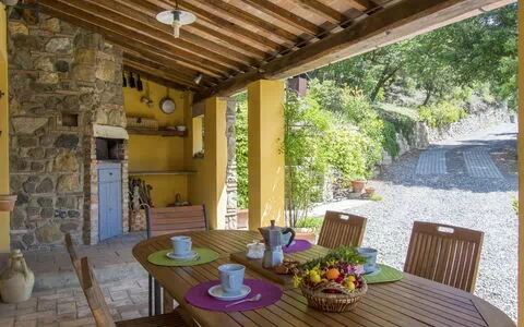 Podere Gabruccino extends across a beautifully landscaped garden that can be accessed directly from the living area, offering a peaceful natural setting to complement the property's rustic interior. The roofed terrace provides a sheltered outdoor space with stunning panoramic views of the mountains and the valley, ideal for relaxing at any time of day. Please be aware that towels are not provided for your stay, so guests are kindly advised to bring their own.