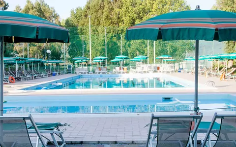 Residence "Italia" offers a vacation rental experience with 65 apartments spread across four stories and two houses. The property boasts an impressive 10,000 square meter fenced area with well-tended gardens and a beautiful swimming pool measuring 25 x 10 meters with a depth ranging from 130 to 190 cm, available seasonally from June 1st to September 15th. Guests can enjoy on-site amenities such as a children's pool, outdoor shower, tennis court, table tennis, and a children's playground. Additionally, the property provides Internet Wifi, Parking, and a Tennis Court for your convenience.