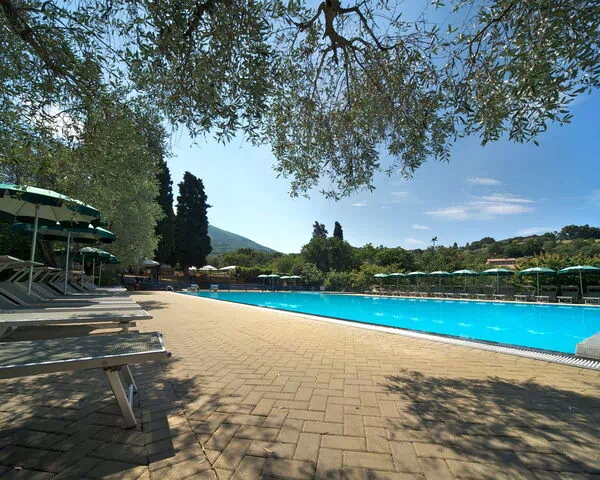 The outdoor spaces at Camping Village Il Fontino are thoughtfully designed to cater to guests of all ages. The main swimming pool, measuring 25 x 12 meters and open from May to September, is complemented by a dedicated children's pool, making it an ideal spot for families with younger guests. An outdoor shower is conveniently located in the pool area for guests' comfort. A playground is also situated on the property, providing children with a safe and enjoyable space for recreation. The surrounding grounds, set within a centenary olive grove, offer a naturally shaded and tranquil environment where guests can stroll, relax, and appreciate the unspoiled Tuscan countryside. The gently sloping hill on which the resort is positioned adds to the scenic character of the outdoor setting, creating a landscape that is both visually captivating and restful.