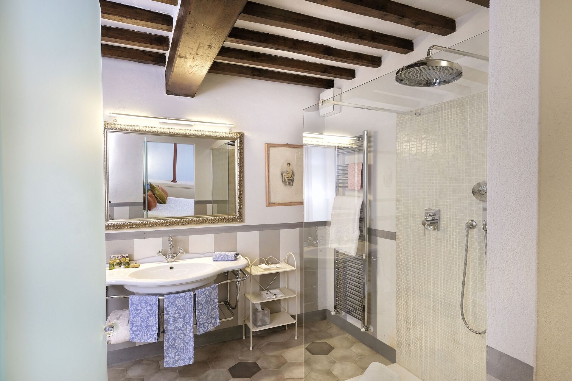 Bedroom + Ensuite Bathroom 6: double bed, sofa bed double, WIFI internet, air conditioning, television, safe, basin, toilet, bidet, shower, exit to the garden.