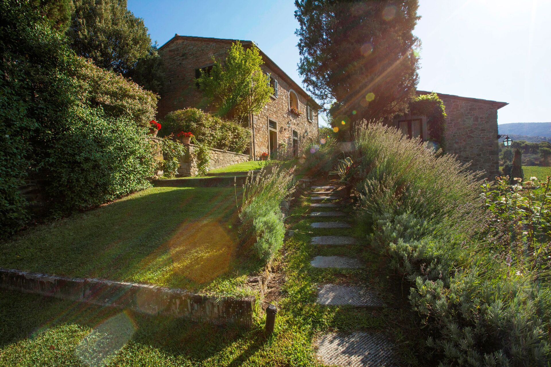 A lovely frescoed ceiling room, with adjoining small kitchen, is located adjacent to the swimming pool, suited to start the day with a breakfast together or to prepare small snacks during the day in the pool. A barbecue is available in the garden close to the swimming pool. The small stone buildings that make up the Borgo del Falco are joined by ladders, small alleys and everywhere the green fields and the garden that surrounds the property. Villa Borgo del Falco has the privilege of its position overlooking Cortona and its hill and the vineyards.