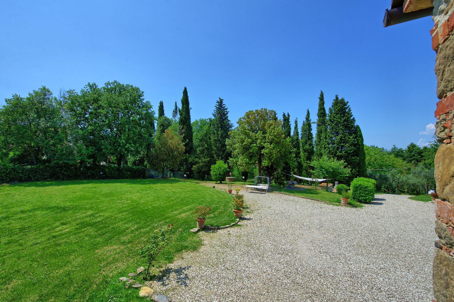 At guests’ disposal: private, enclosed pool with colored lighting (11 different colors) (13 x 6 metres; depth: from 0,90 to 2,40 metres); large sundeck with sun loungers, umbrellas and sunshades; shower near the pool (hot and cold water) and lavapiedi; large, 9000 m2 park (fenced in); spacious, paved area equipped with barbecue, table and chairs for eating outside; wood-burning oven for making pizza and bread; 7 bedrooms with air conditioning; large common area for comfortably accommodating up to 18 people, consisting of living area with fireplace, billiard table, dining area, bathroom and kitchen with direct access to the outdoor dining area; parking within the grounds.