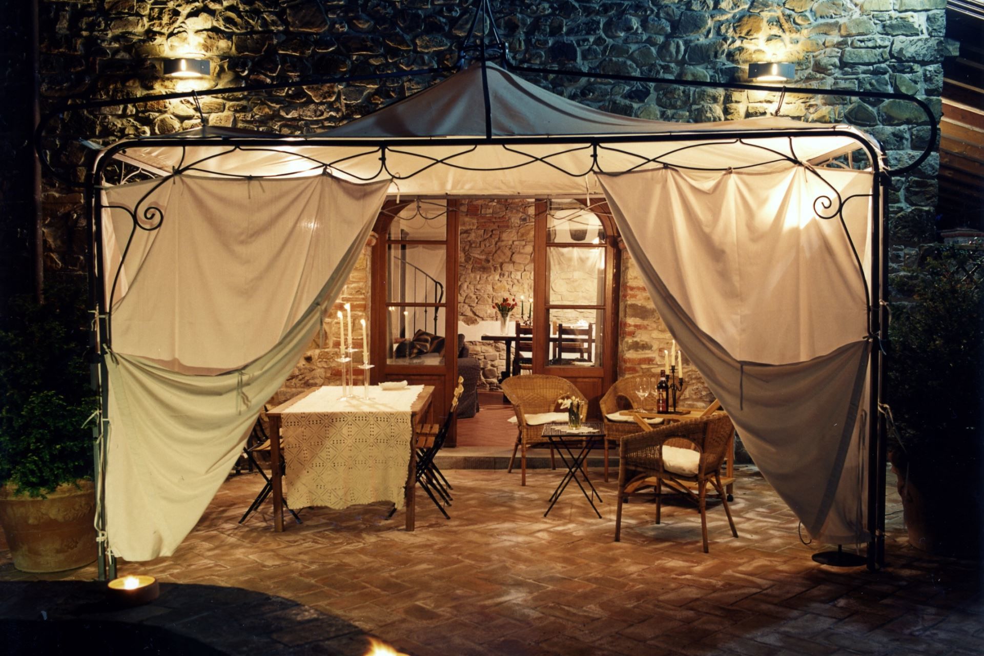 GROUND FLOOR: entrance from a large pergola furnished with armchairs, tables and garden furniture on a living-dining room with kitchen corner, sitting room with sofas, satellite TV and ancient fireplace.