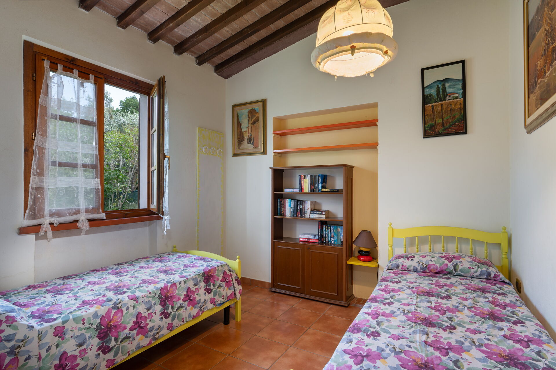 Bedroom 2: two single beds, portable fan.