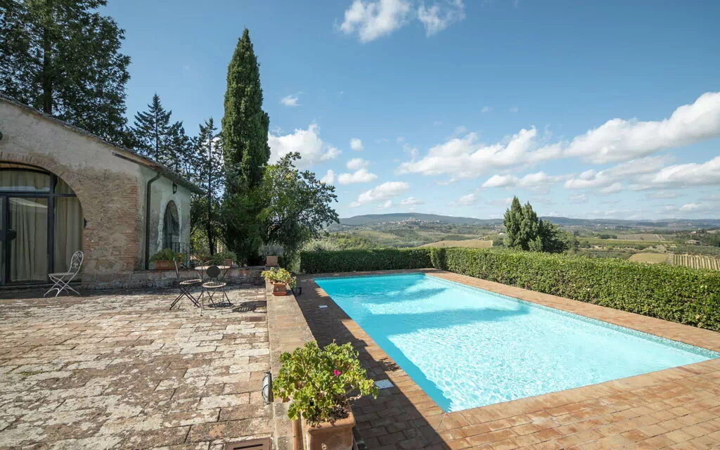 Nestled on a hilltop in the Casaglia district of Poggibonsi, Italy, "Vedi Torre" is a beautifully restored 18th-century country house that offers an exceptional holiday rental experience for larger groups and families. Renovated in 2004, this charming rural residence comprises 2 apartments that connect with one another from the outside, combining generous space with a warm and tranquil atmosphere. Surrounded by open fields and mature trees, the property commands breathtaking panoramic views of the Tuscan countryside, creating an idyllic setting for rest and rejuvenation. Guests benefit from a private park and garden that provides ample room to relax and explore, as well as a generously sized swimming pool perfect for warm-weather days. Parking is available directly on the premises, ensuring a convenient and stress-free arrival, and Wi-Fi internet connectivity is provided throughout the property to keep you comfortably connected during your stay.