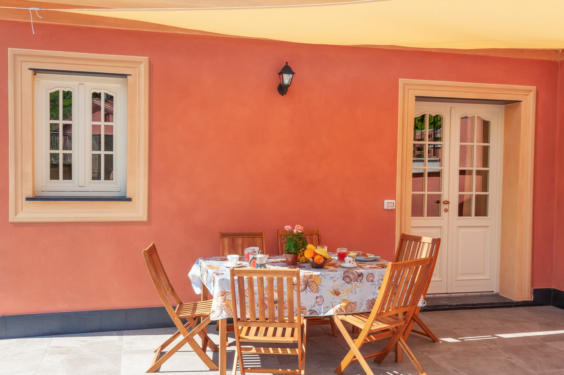 Large terrace with table, chairs and sunshade.