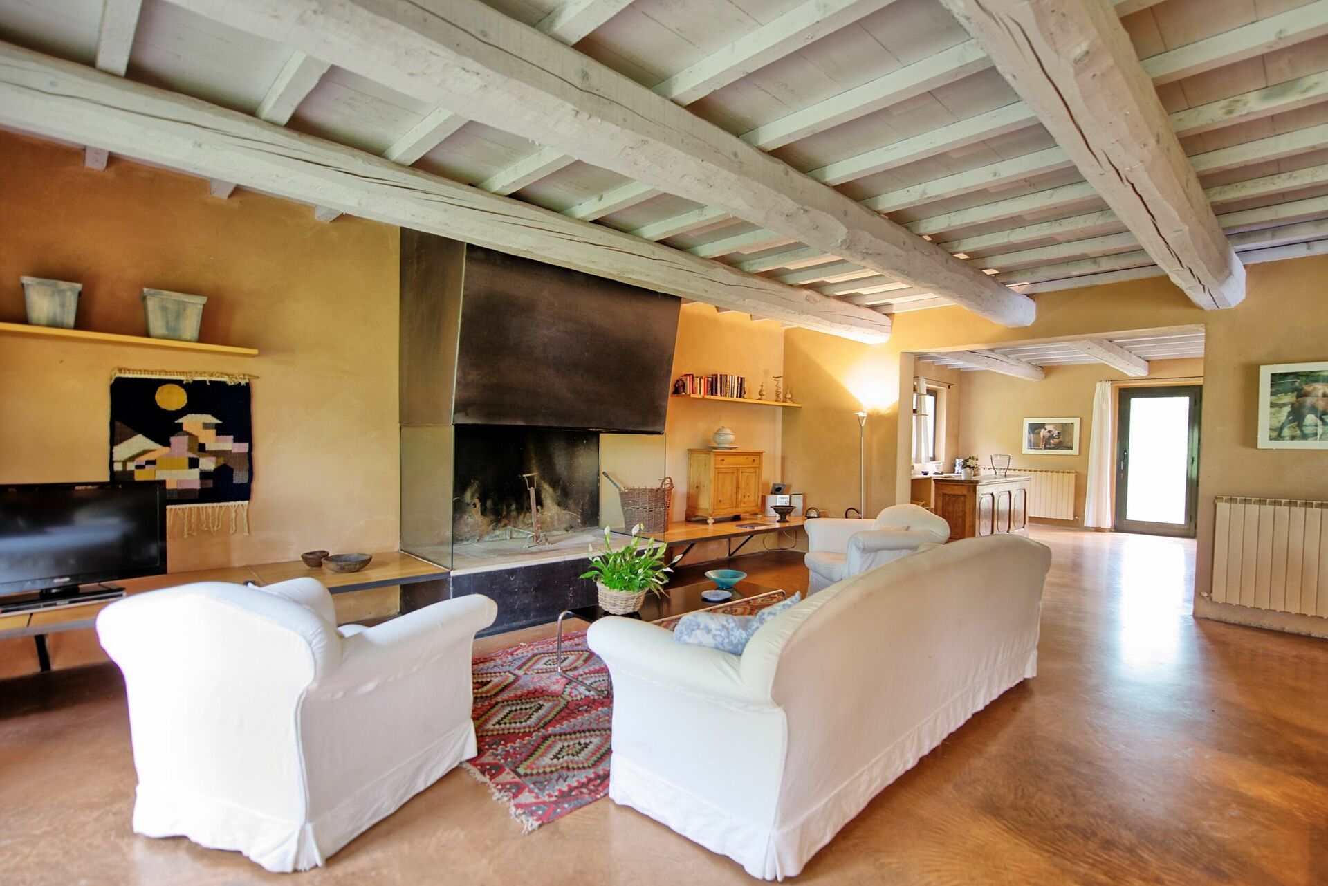 Ground Floor: entrance with large living room with a working fire place, sofas and arm chairs, dining table, TV satellite, dvd, wi-fi.